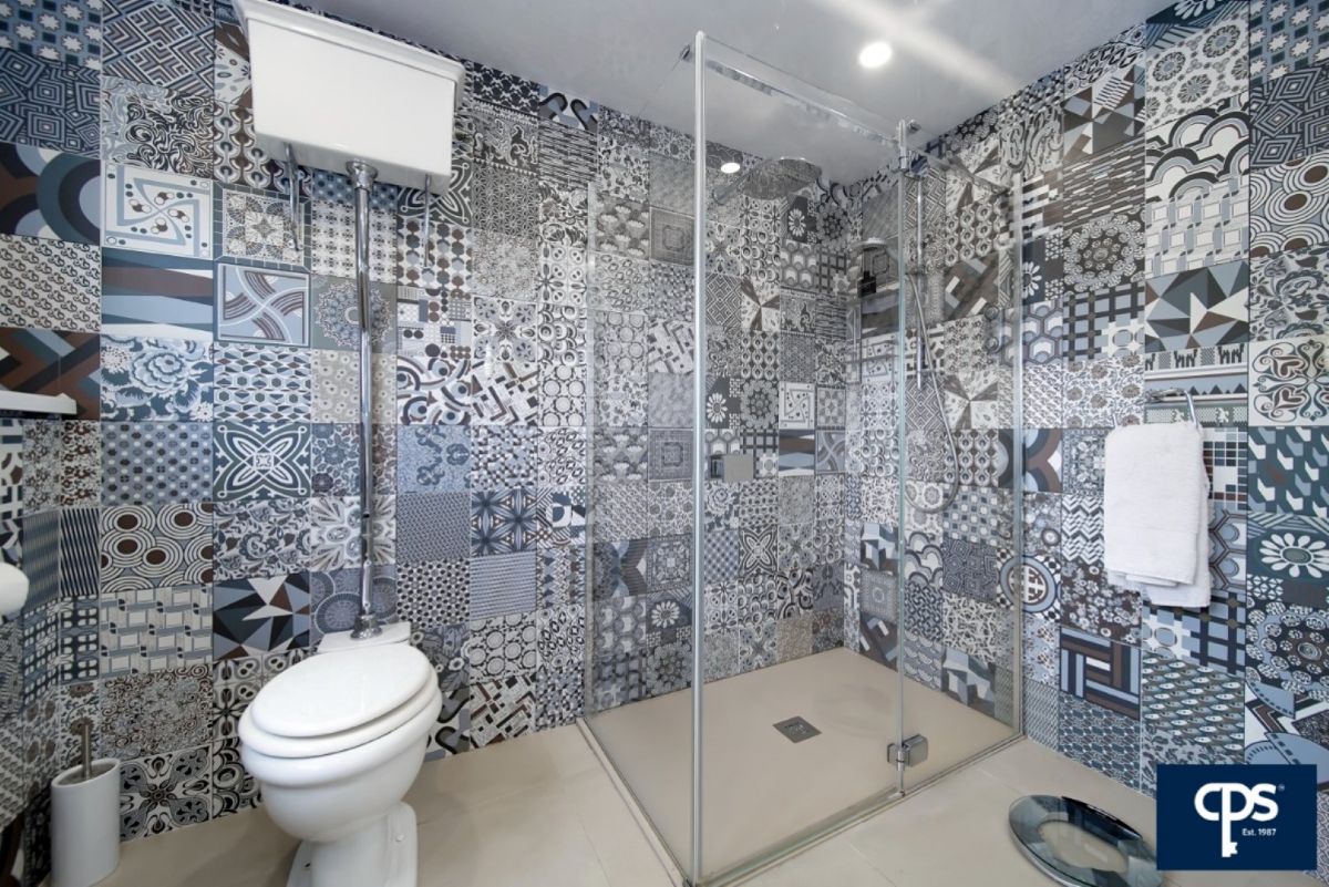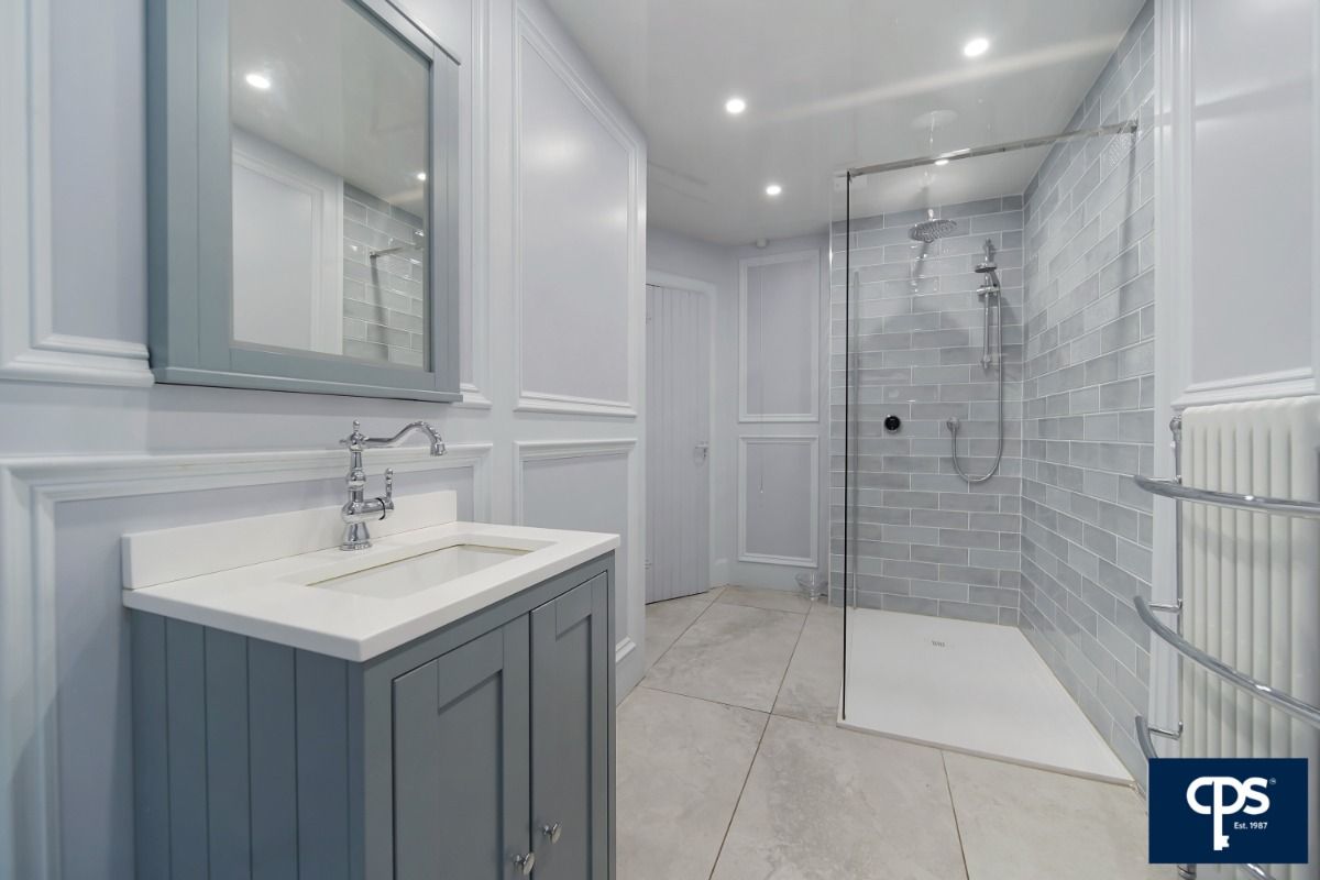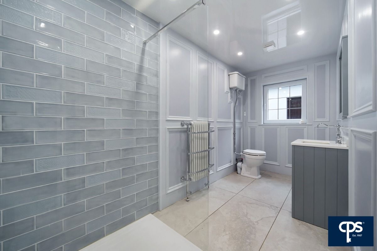 Contemporary shower room with high level toilet with cistern, basin and vanity unit, Aqualisa digital shower. Tile flooring with wall panelling and tiling to shower area.
