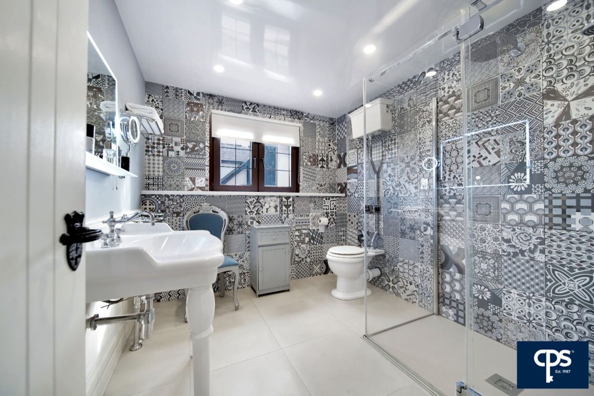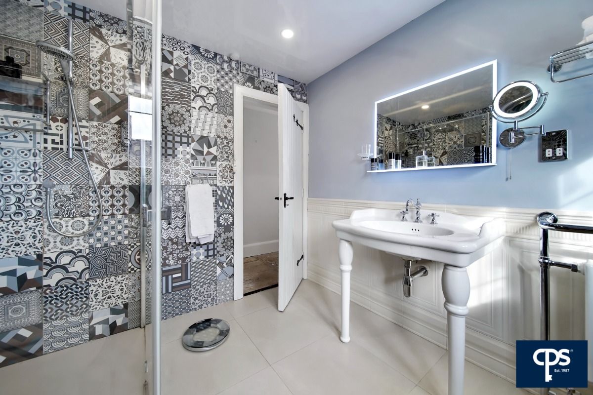 Stunning en-suite facility comprising a high-level toilet with cistern, deluxe basin and Digital Aqualisa shower, complete with floor and wall tiling.