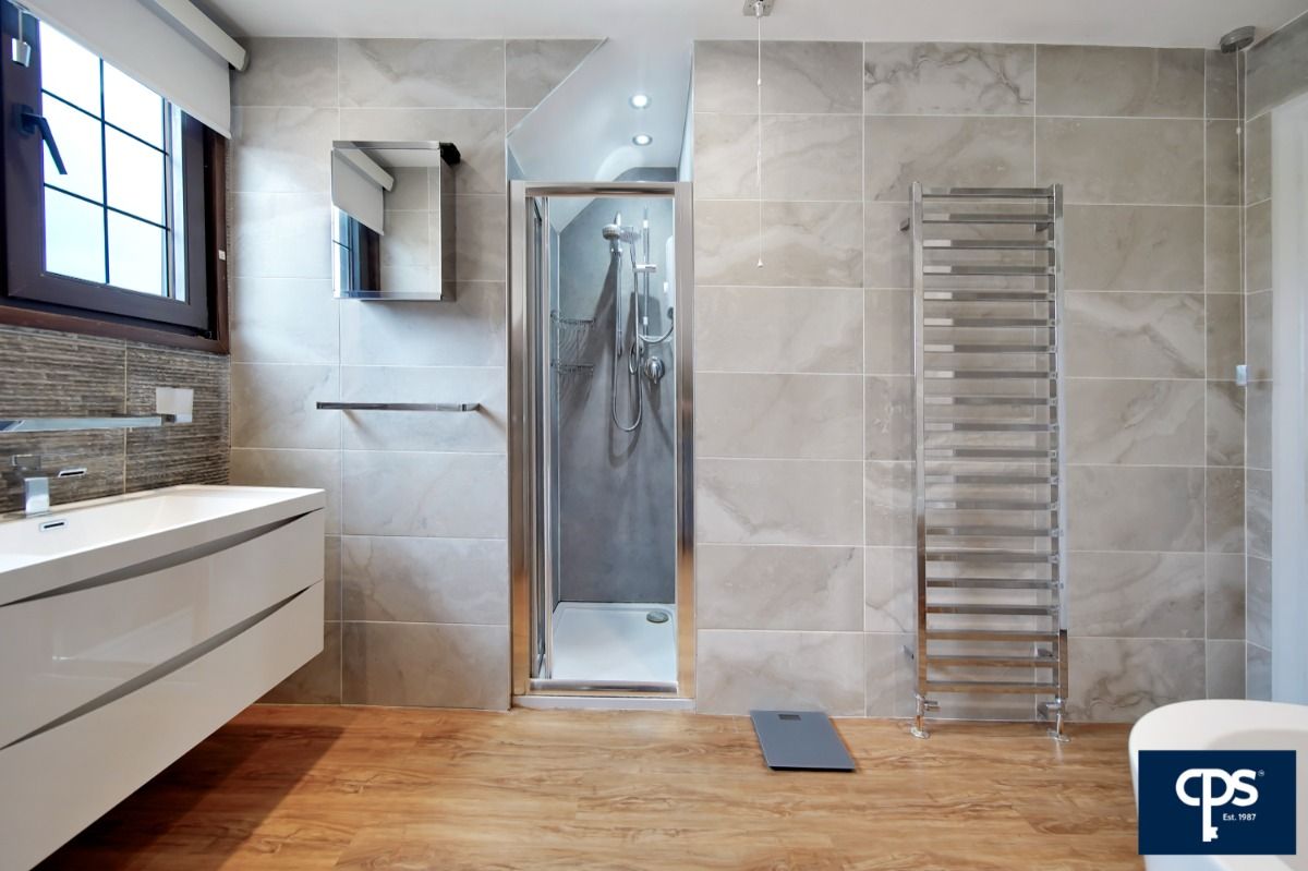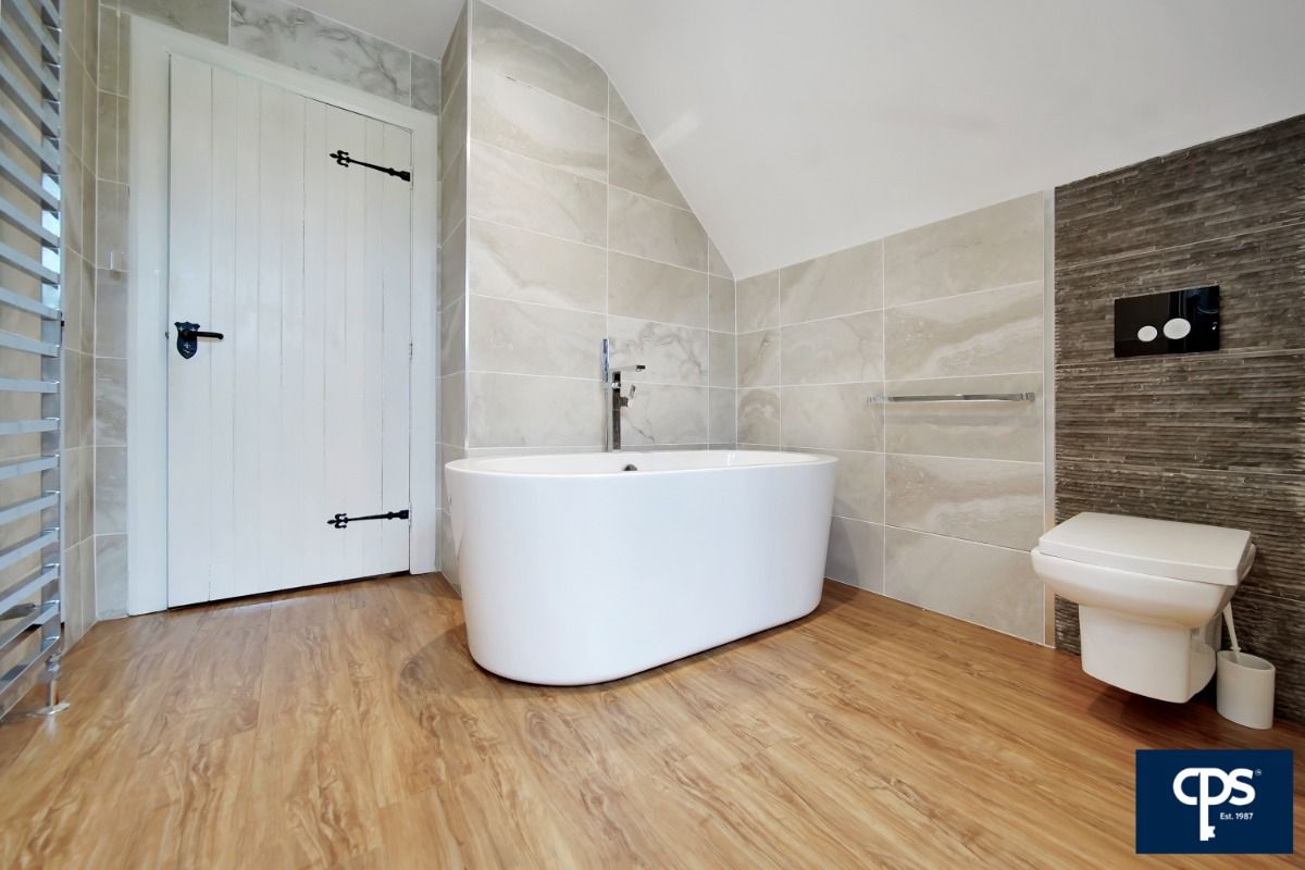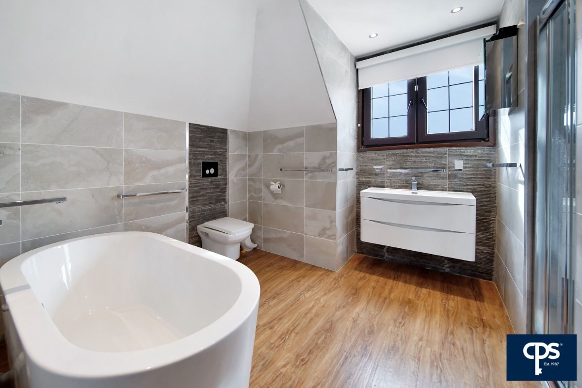 Spacious bathroom comprising a white suite with low flush w.c., floating basin and vanity unit, freestanding bathtub, heated towel rail and separate electric and mains shower.