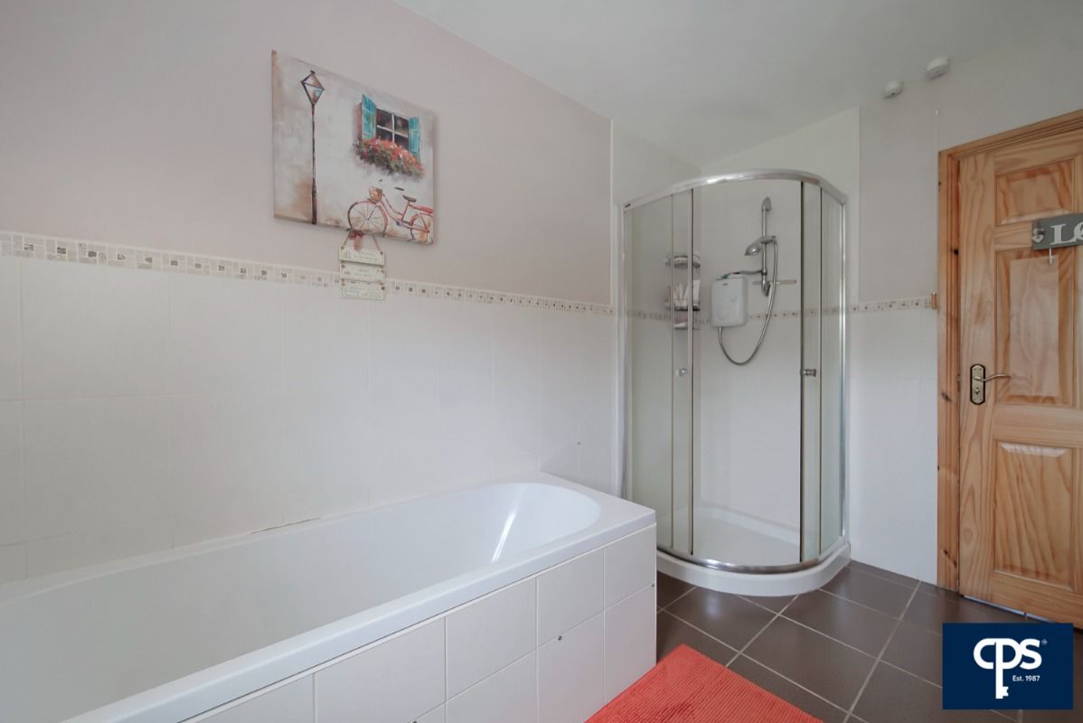 White suite comprising toilet, basin, pedestal, panelled bath with separate corner shower. Heated towel rail. Tile flooring with partial wall tiling.