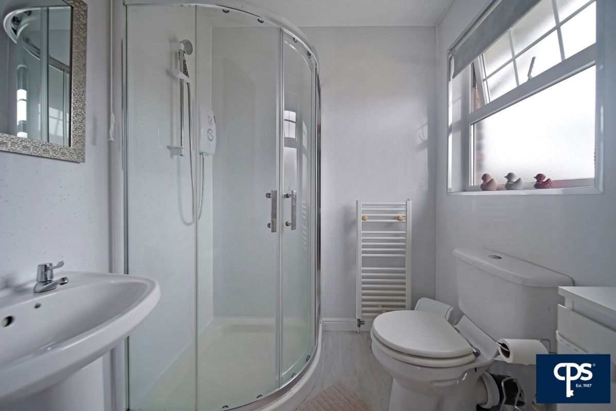Toilet, basin, pedestal. Corner electric shower. Vinyl flooring. PVC wall panelling.
