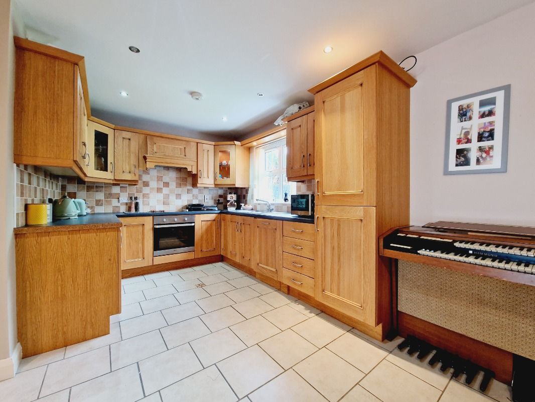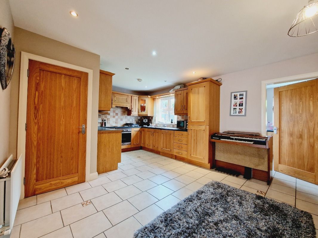 Stunning solid wooden kitchen with integrated appliances to include electric oven, hobs & extractor fan. Dishwasher. Fridge/freezer. Stainless steel sink & drainer. Tile flooring with partial wall tiling.