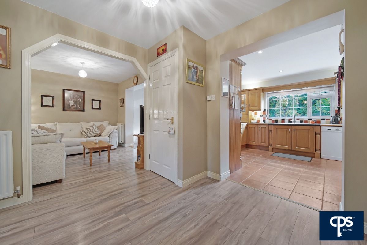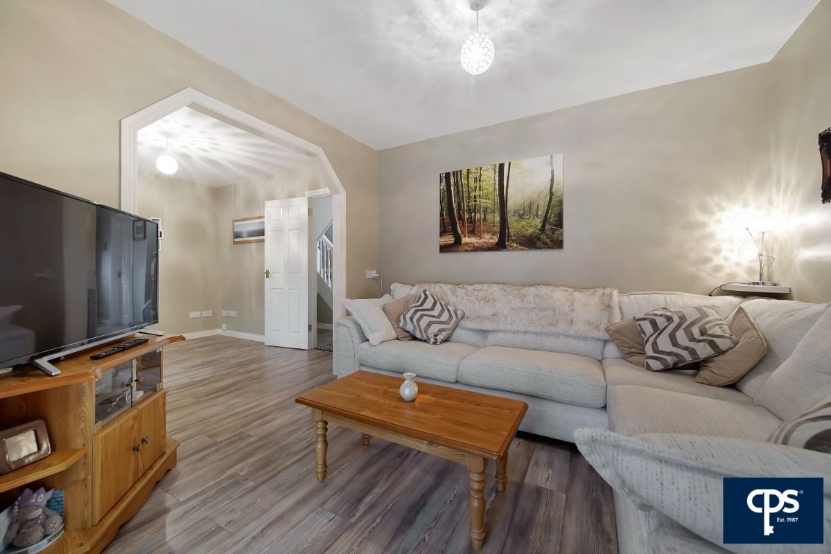 Open-plan to the kitchen/dining area, finished with laminate wood flooring, ideal for family living.