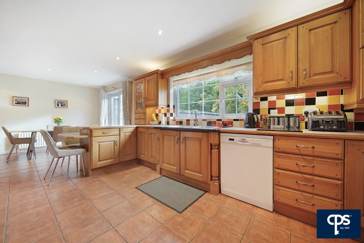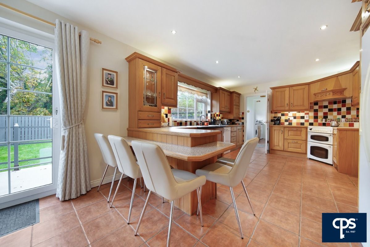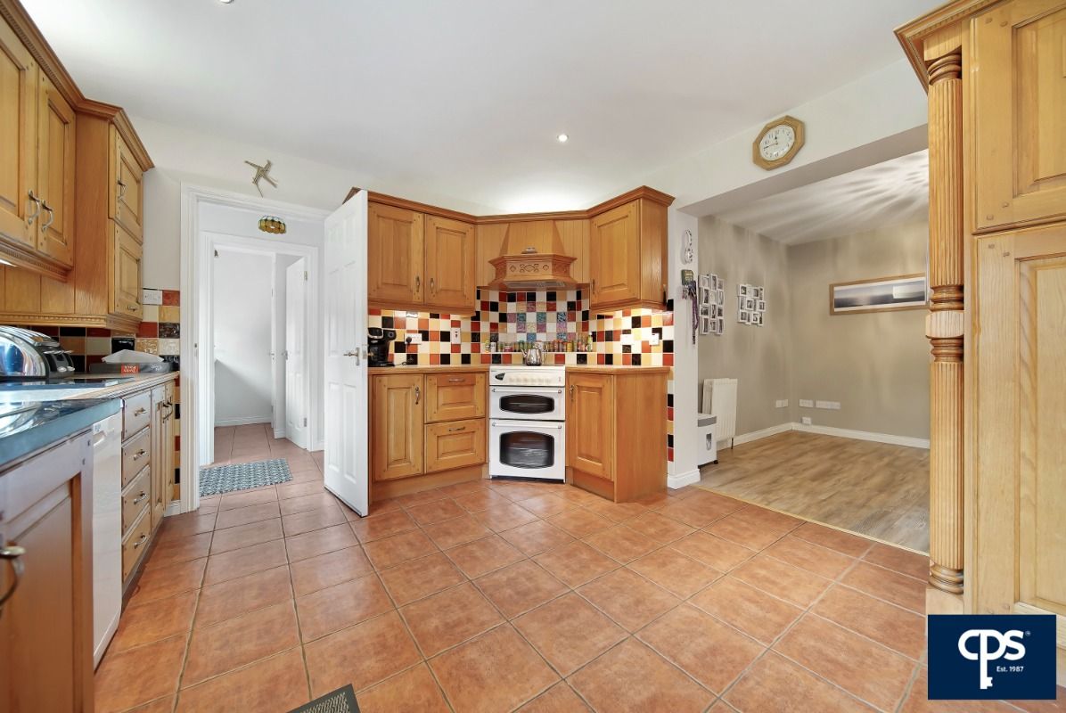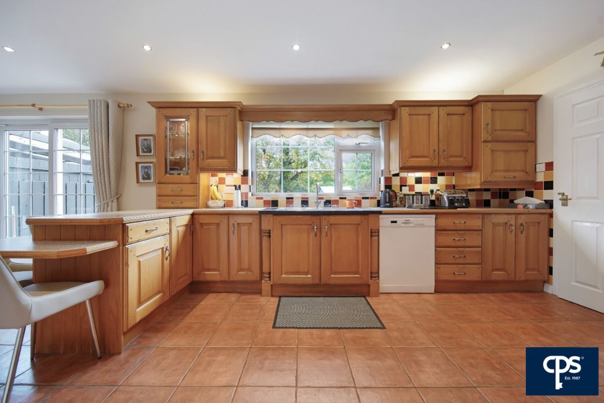 Fitted solid wood kitchen with a range of high and low level units, tiled flooring and partial wall tiling. Dining area with sliding patio doors to the rear.