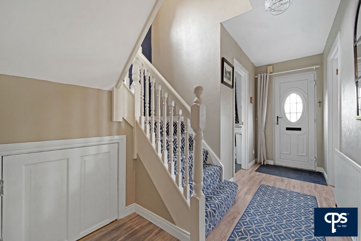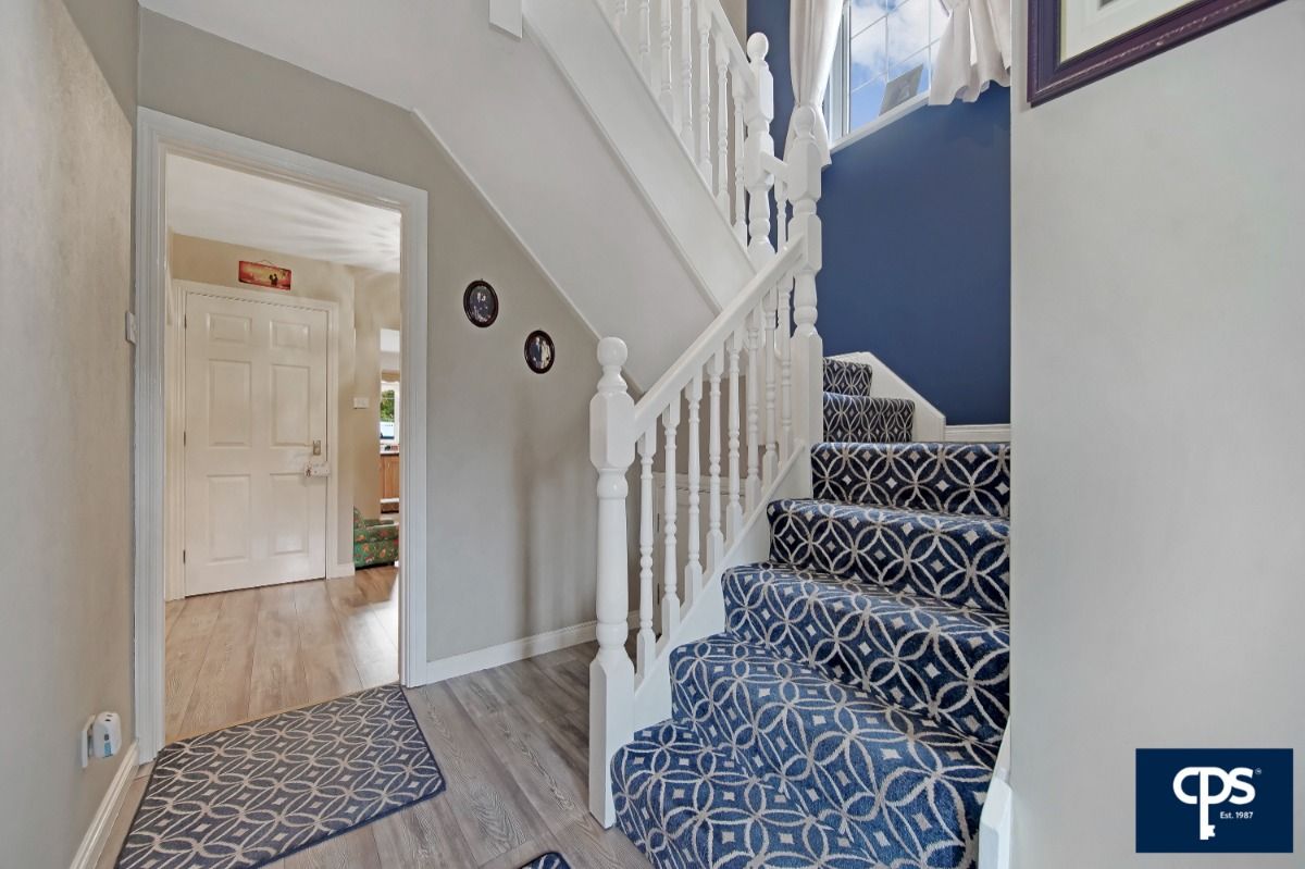 Bright entrance hallway with laminate wood flooring and staircase leading to the first floor.