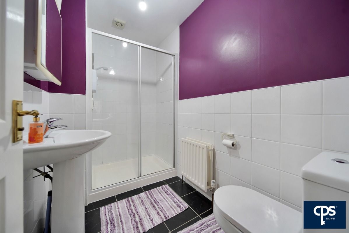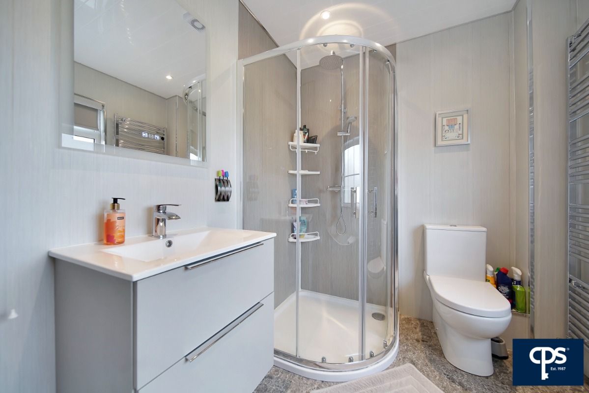 Modern white suite comprising WC, basin with floating vanity unit, corner electric shower and separate bath. Finished with vinyl flooring and wall-mounted heated towel rail.