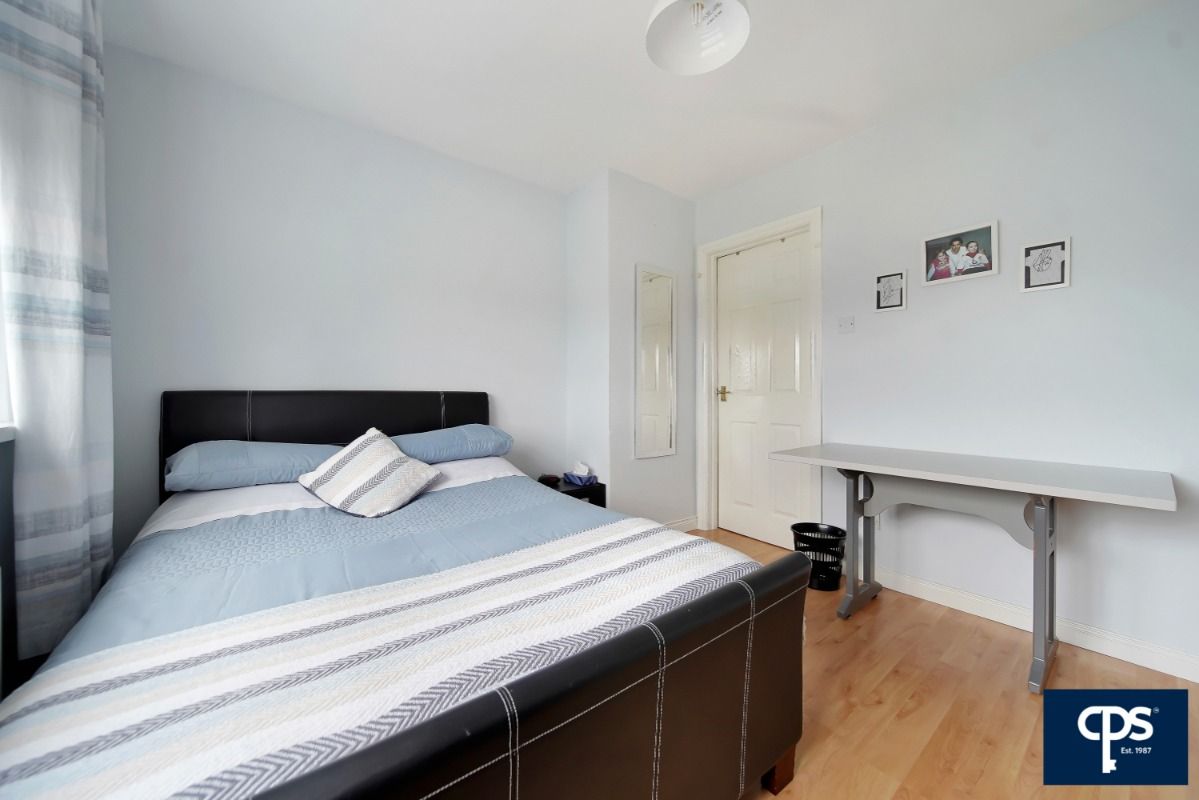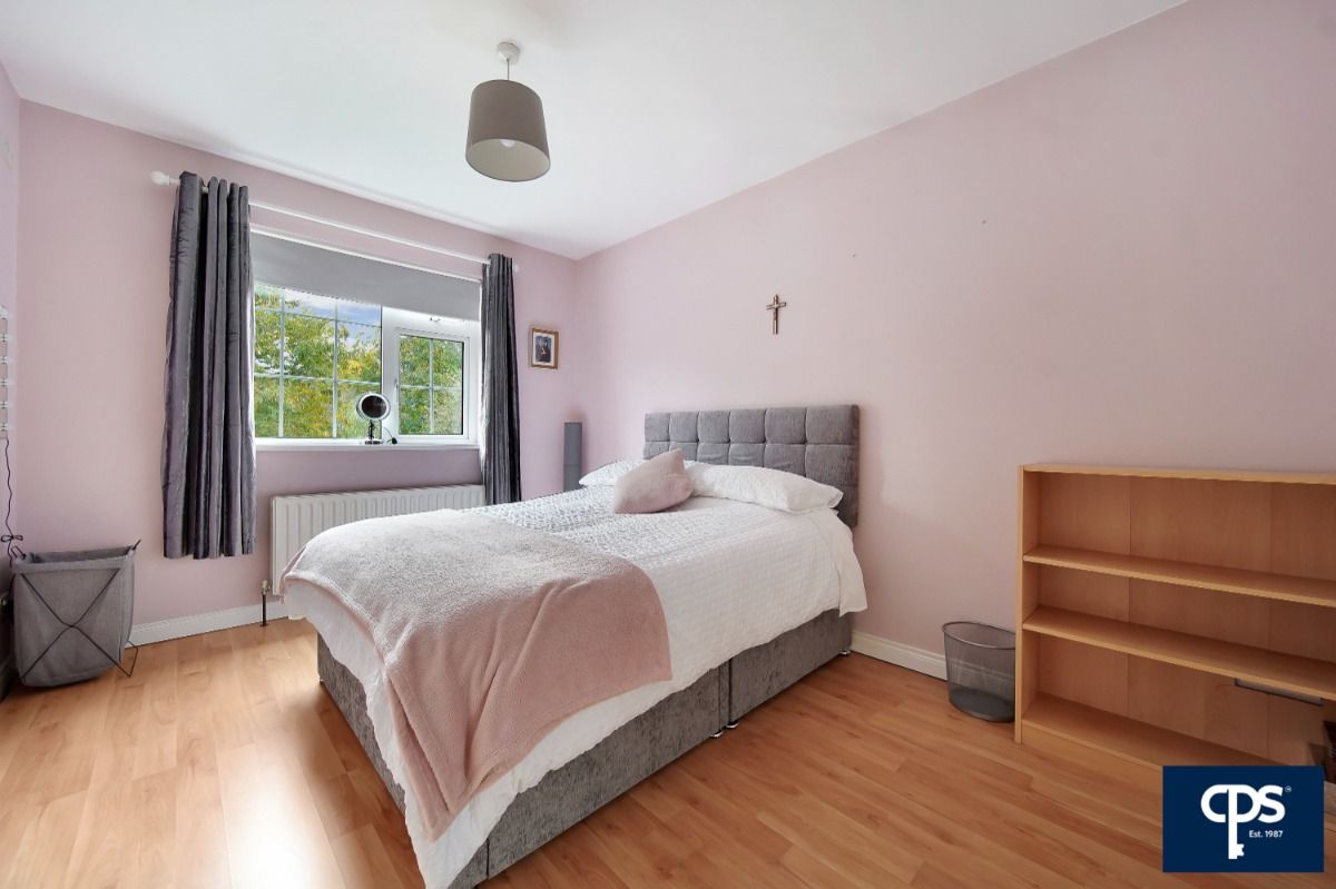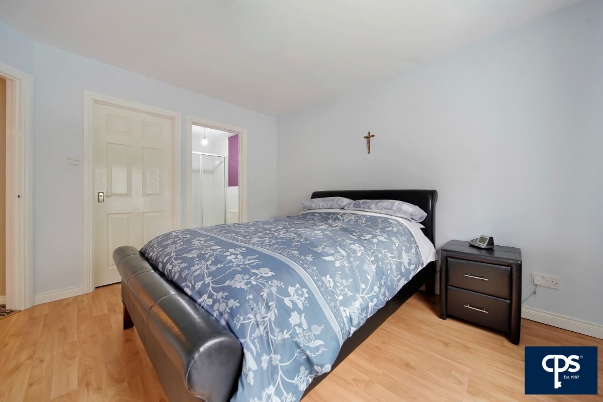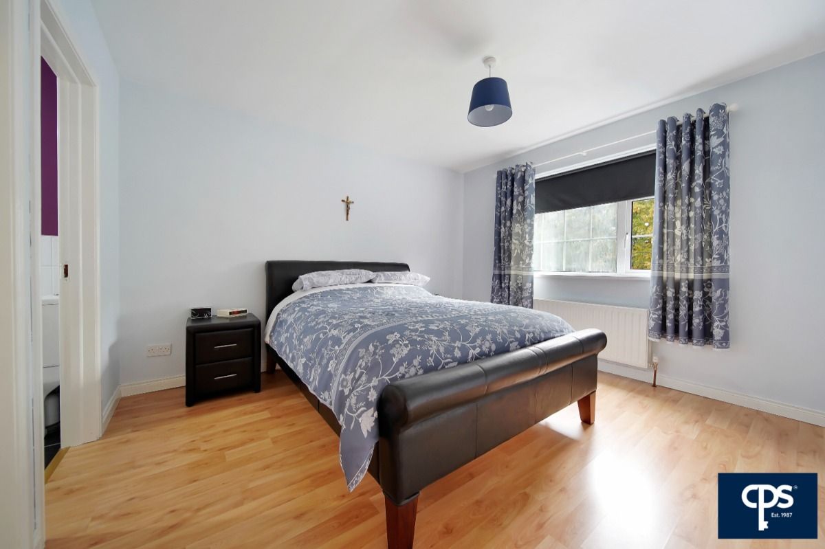 Generous double bedroom with laminate wood flooring and walk-in wardrobe.