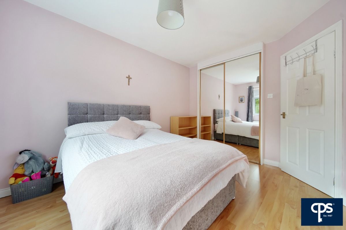 Double bedroom with laminate wood flooring and sliding fitted wardrobes.