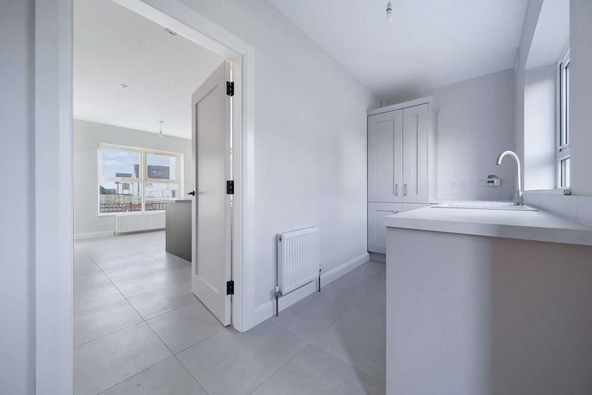Modern fitted units, washing machine, tumble dryer, tiled floor covering, composite PVC exterior door and extractor fan.