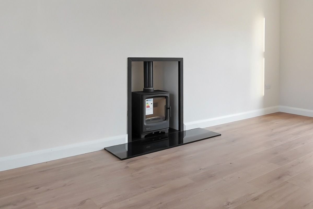 Laminate wooden floor covering and multi-fuel stove.