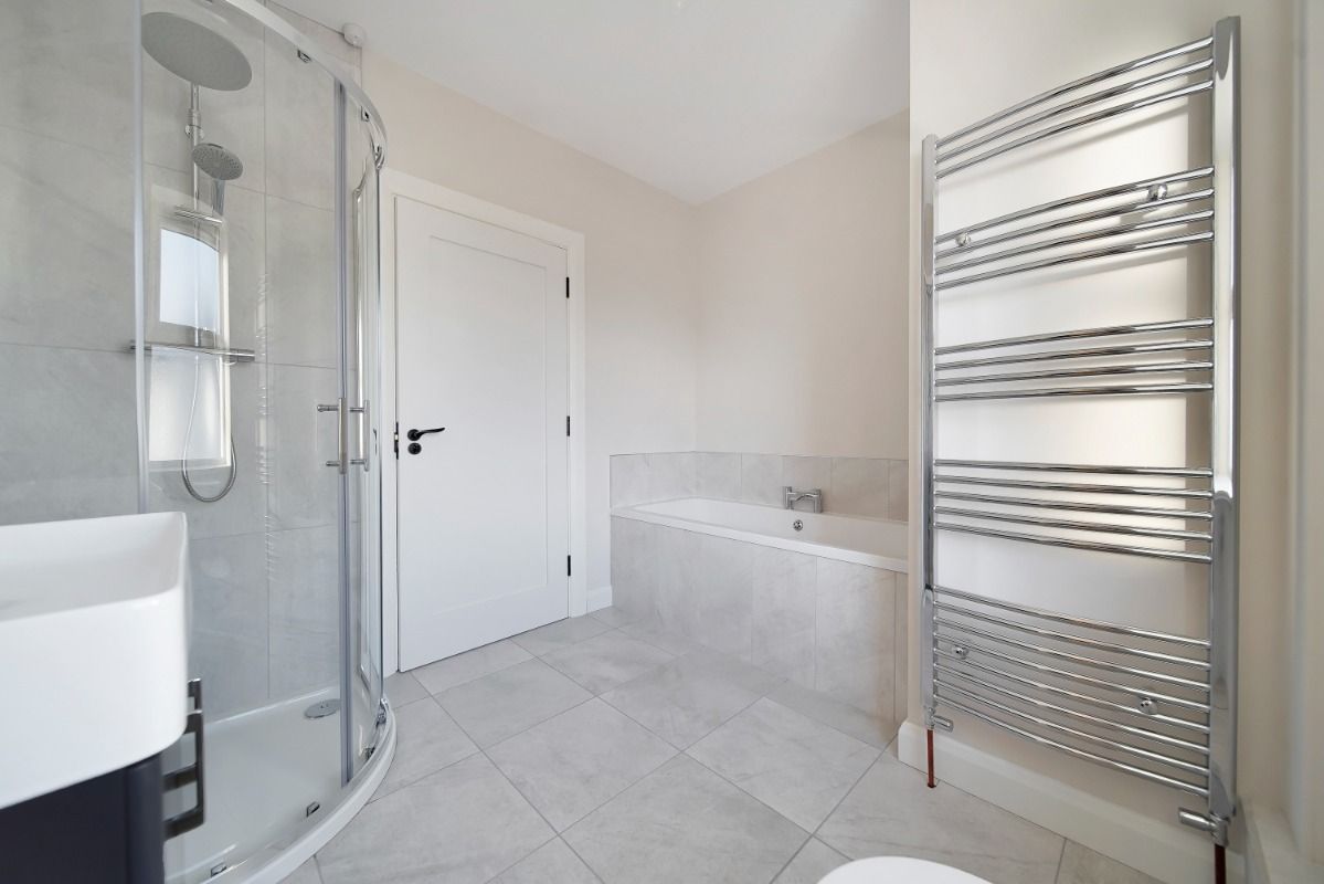 Tiled floor covering, separate bath and mains gas shower, heated towel rail, recessed lighting and extractor fan.