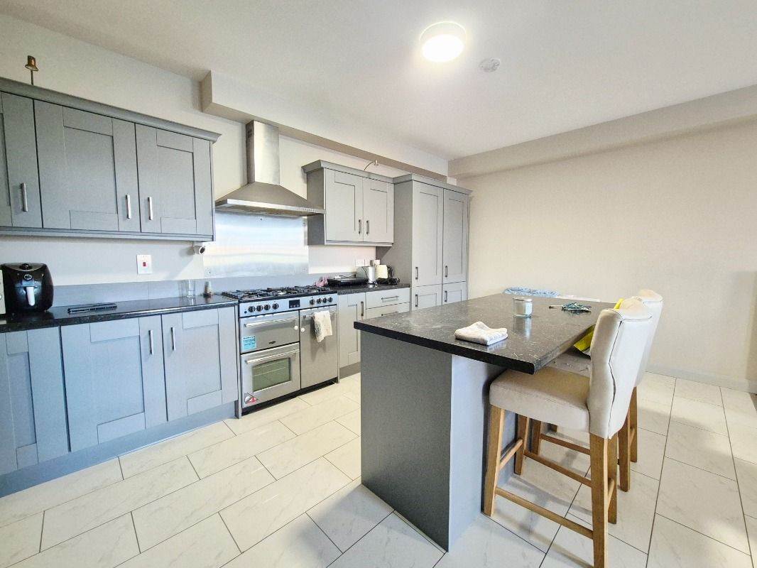 Impressive high- and low-level kitchen units to include integrated fridge/freezer, dishwasher, electric oven, gas hobs and washing machine. Stainless steel sink and drainer. Kitchen island with additional storage. Kitchen area is complete with tile flooring with the living area is finished with laminate wooden flooring.