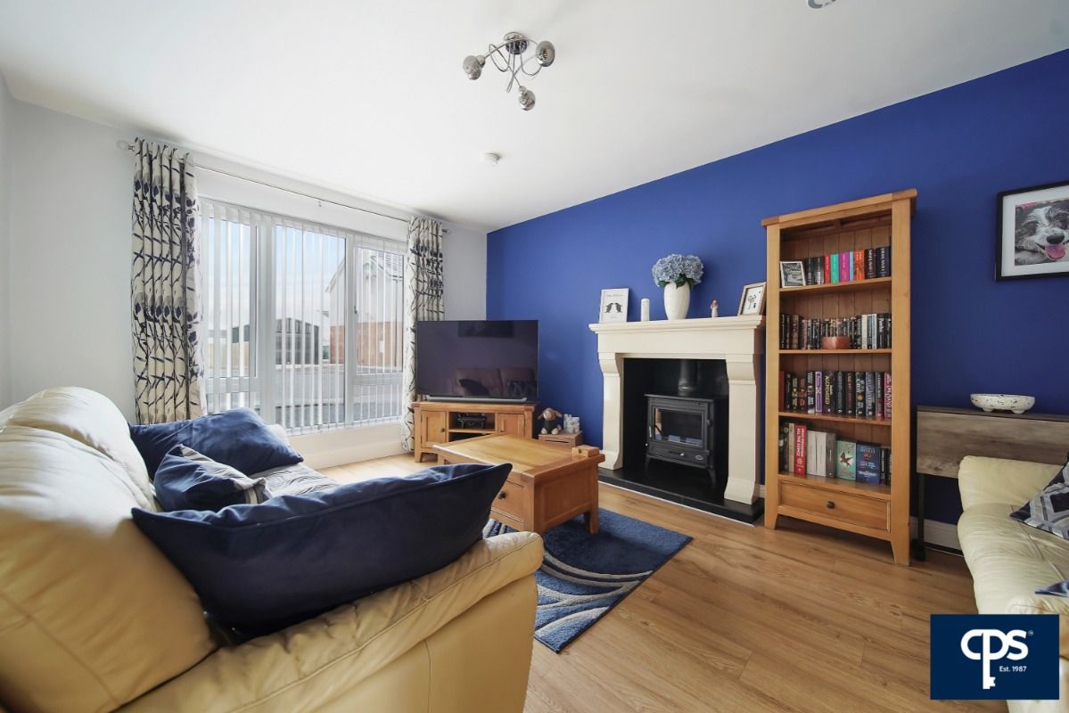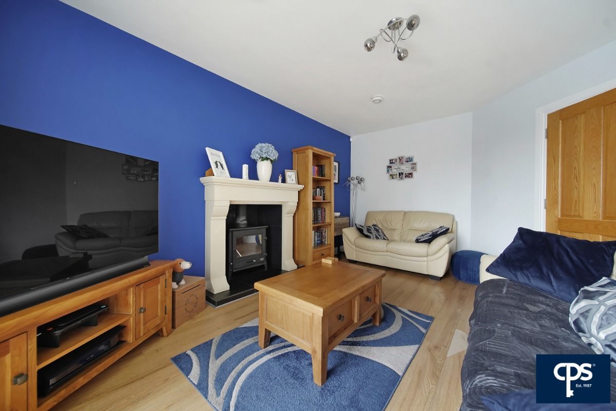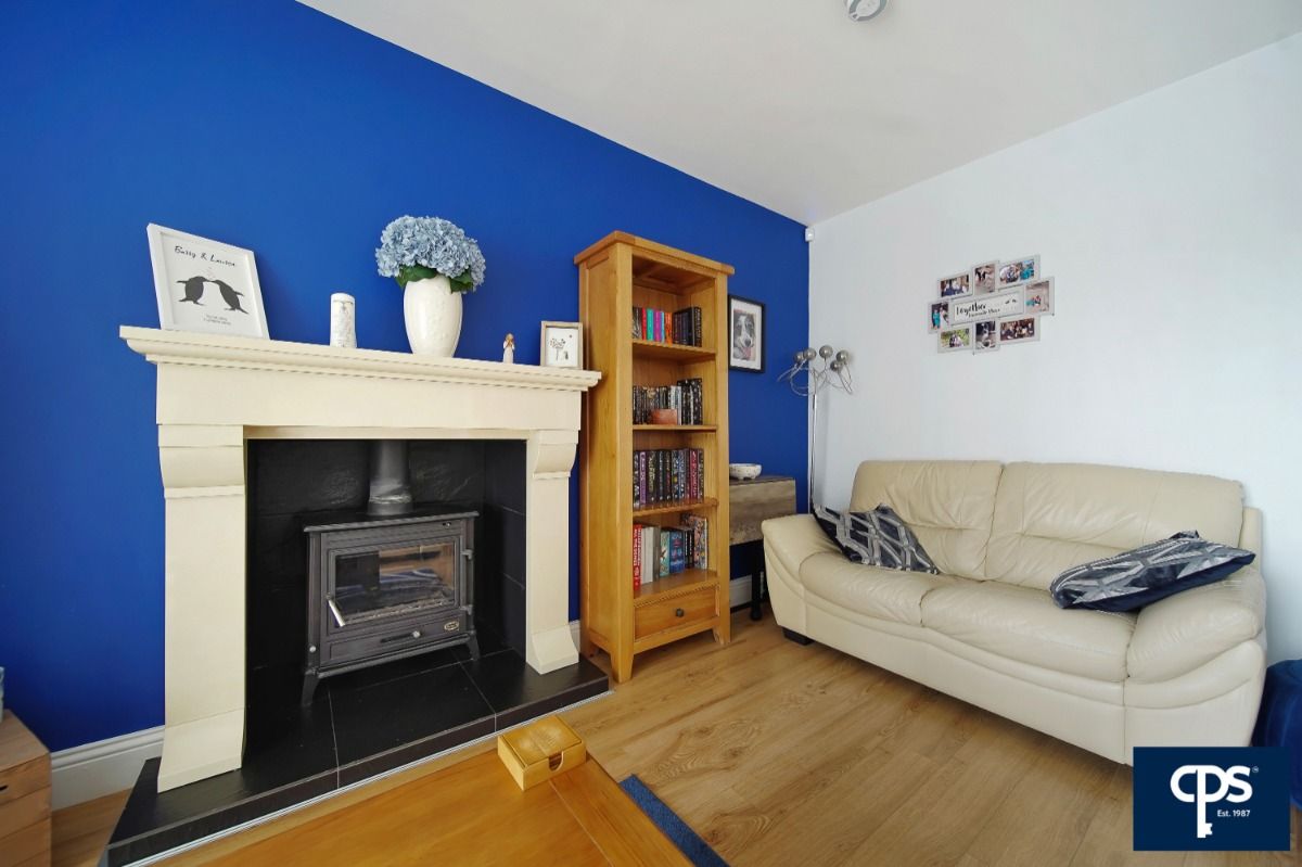 Well-proportioned reception room with wooden flooring and a feature fireplace incorporating an inset stove and back boiler, creating a warm and inviting focal point.