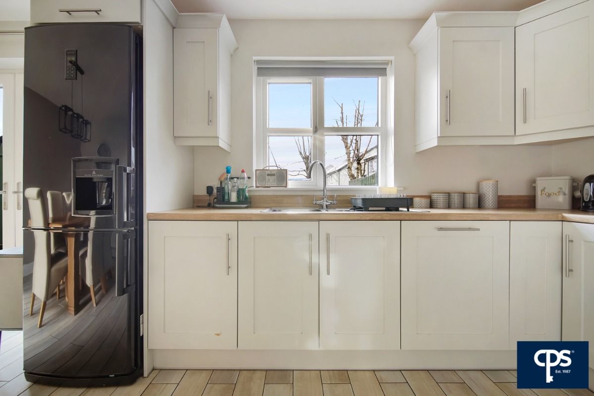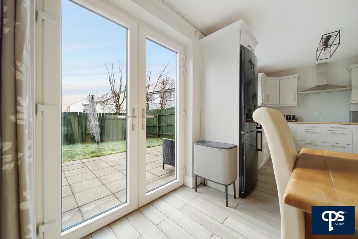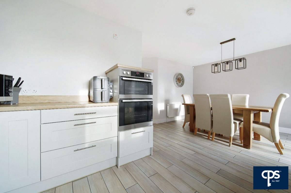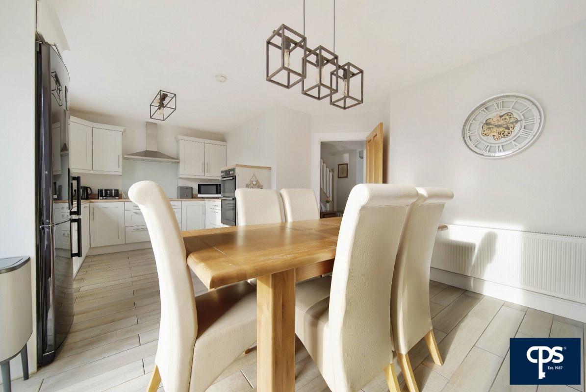 Spacious and bright open-plan kitchen/dining area featuring an excellent range of high- and low-level units. Fully fitted with fridge freezer, electric oven, hob and extractor fan, and dishwasher. Finished with tiled flooring and double patio doors leading to the rear garden, allowing for excellent natural light.