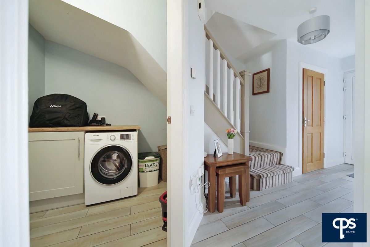 Practical utility space with low level units, plumbed for white goods and finished with tiled flooring.