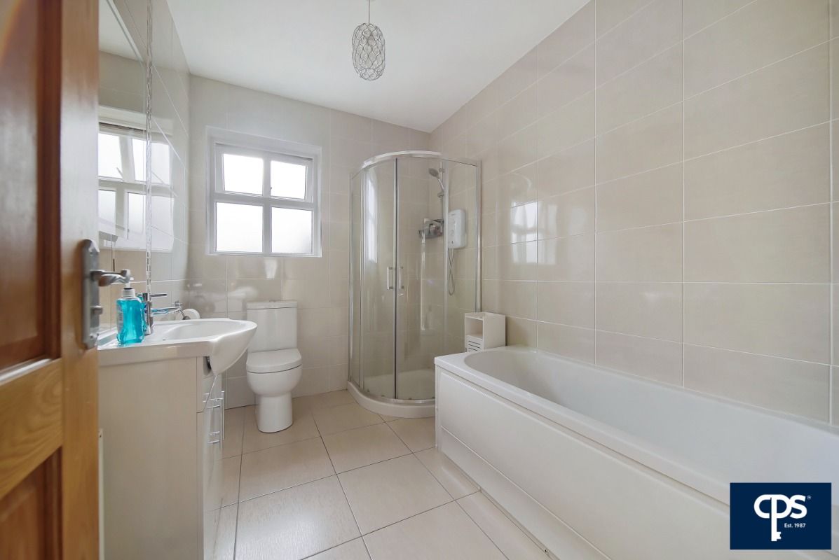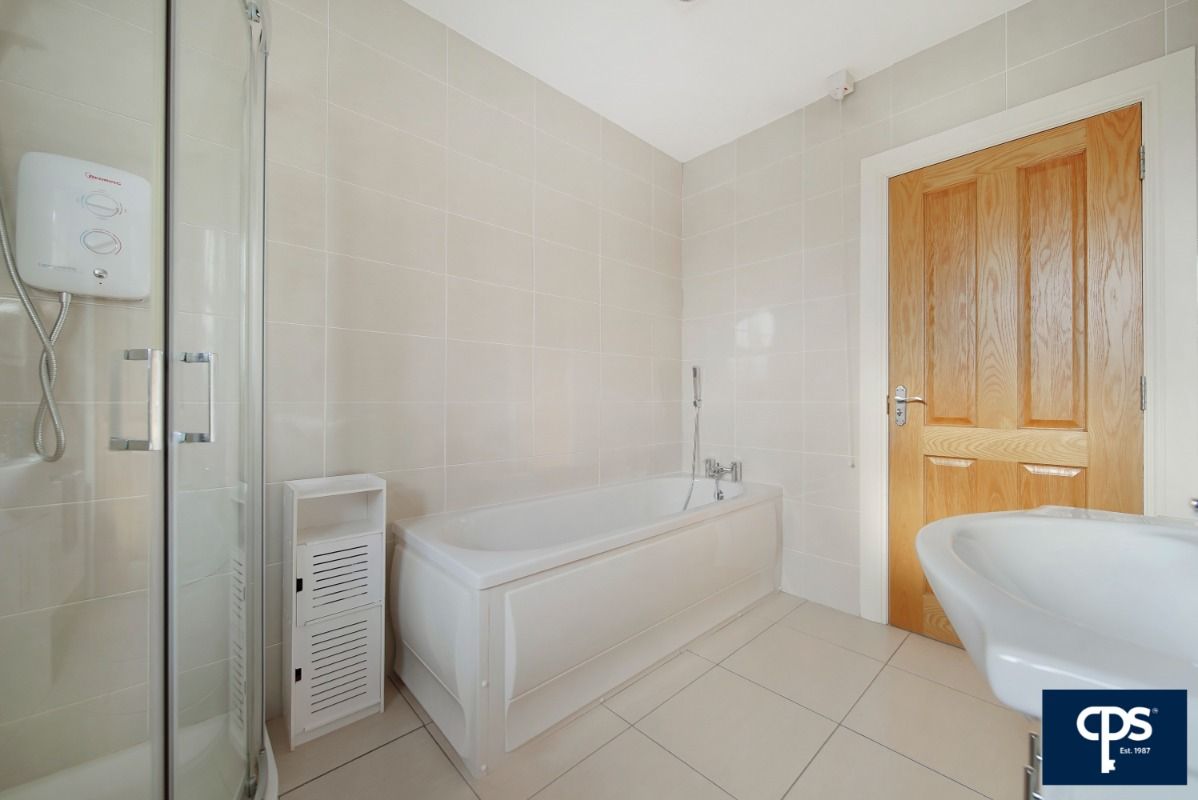 Fully fitted white suite comprising toilet, wash hand basin with vanity unit, panelled bath and separate electric corner shower. Floor and wall tiling throughout.