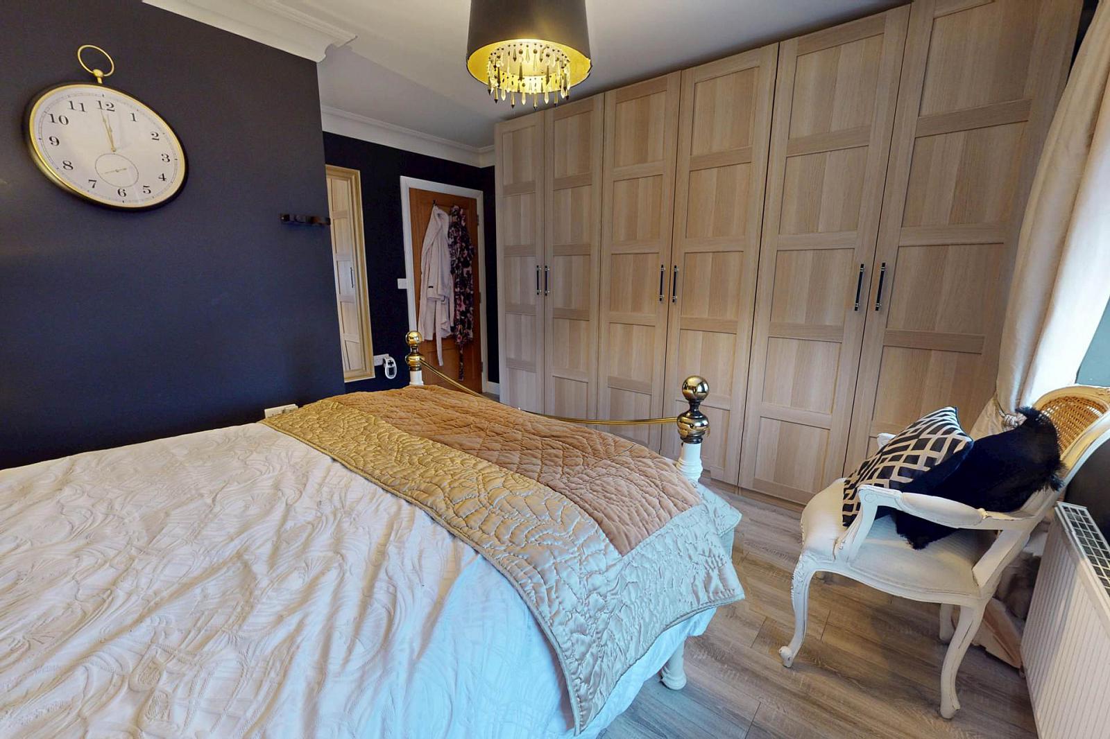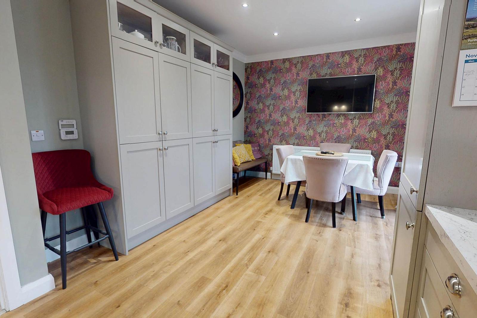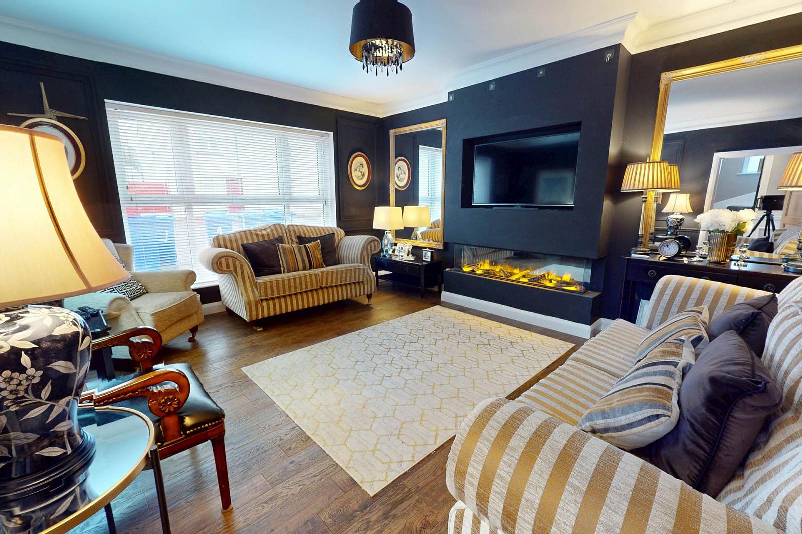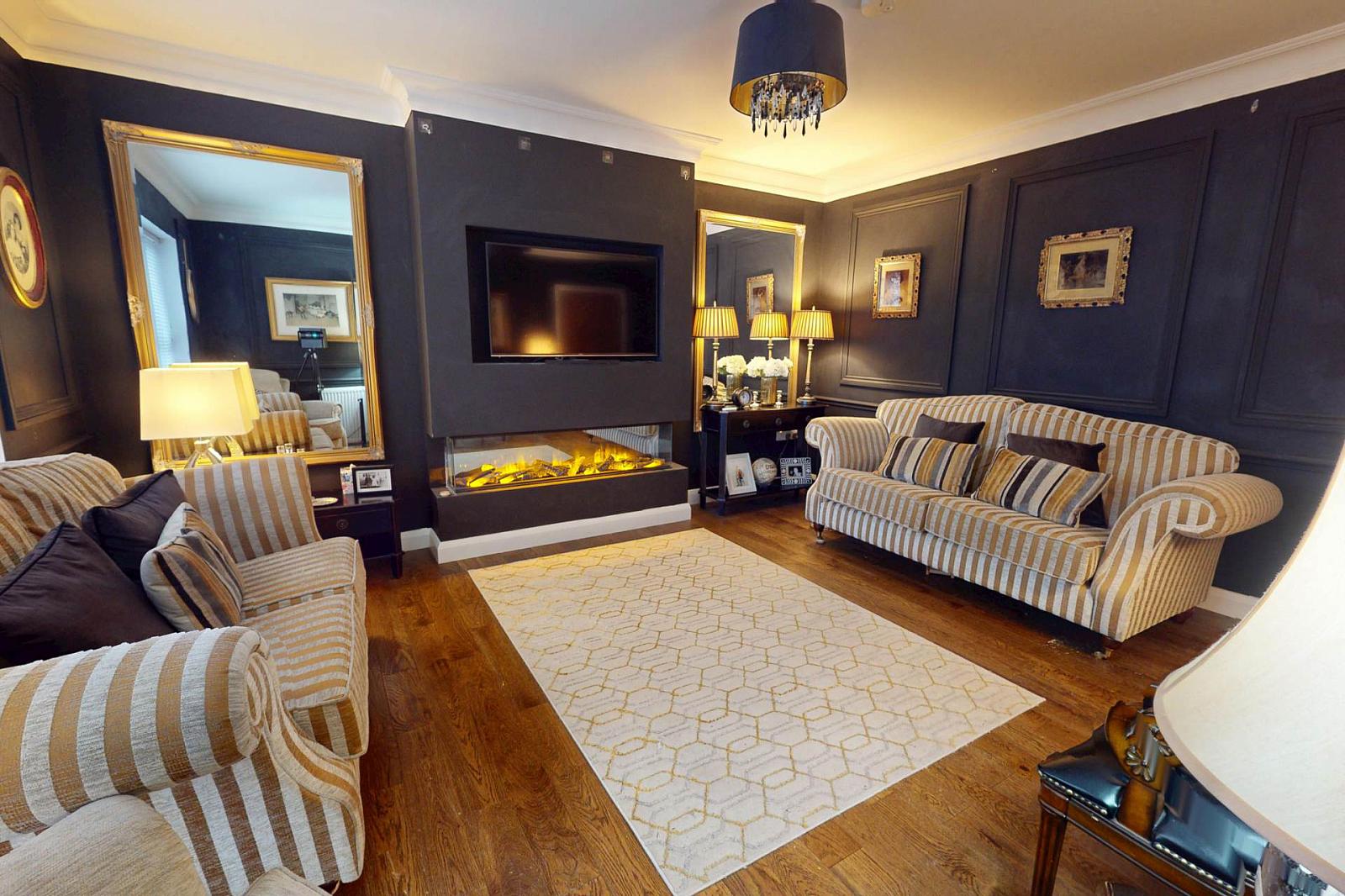 This three-bedroom residence blends contemporary style with thoughtful detailing. Bespoke panelling greets you in the entrance hallway and continues into the living room, where dark-painted walls, ceiling coving, and a sleek electric fireplace create a striking yet welcoming space. Large windows flood the home with natural light, softened by tailored blinds for privacy and control.
