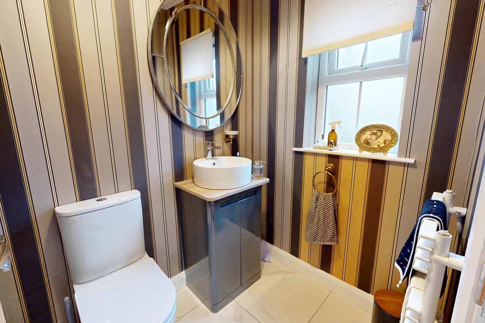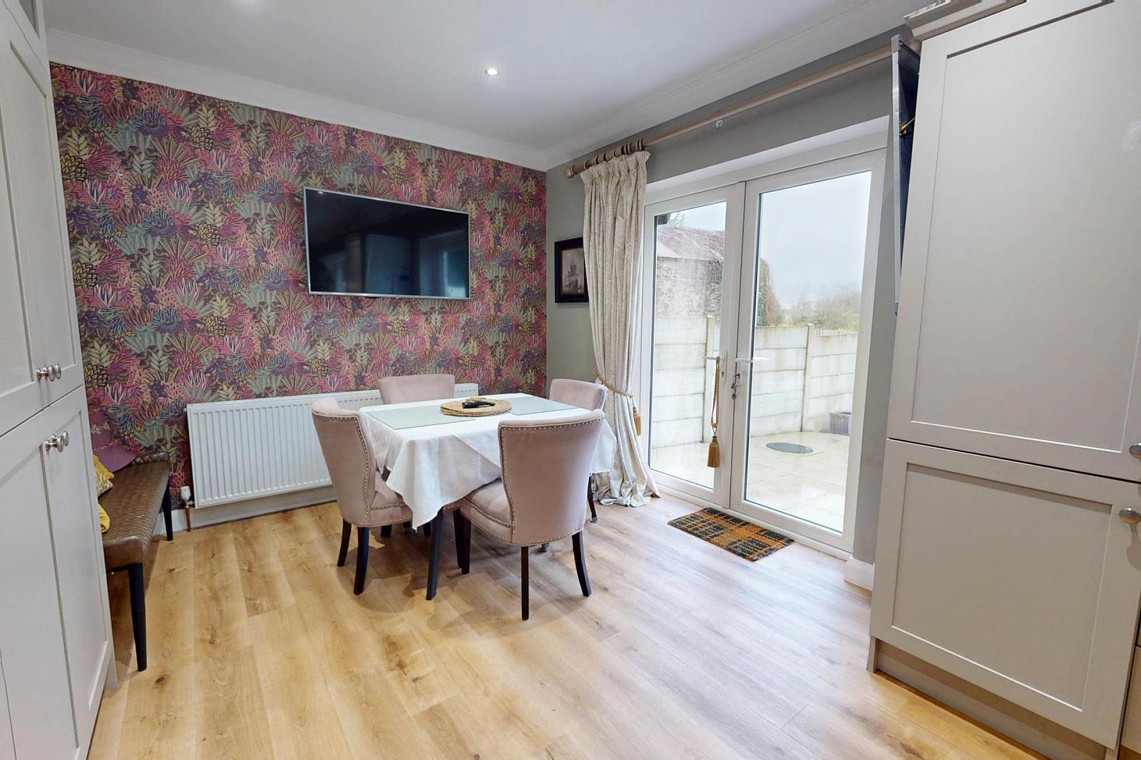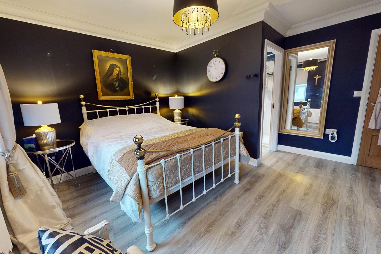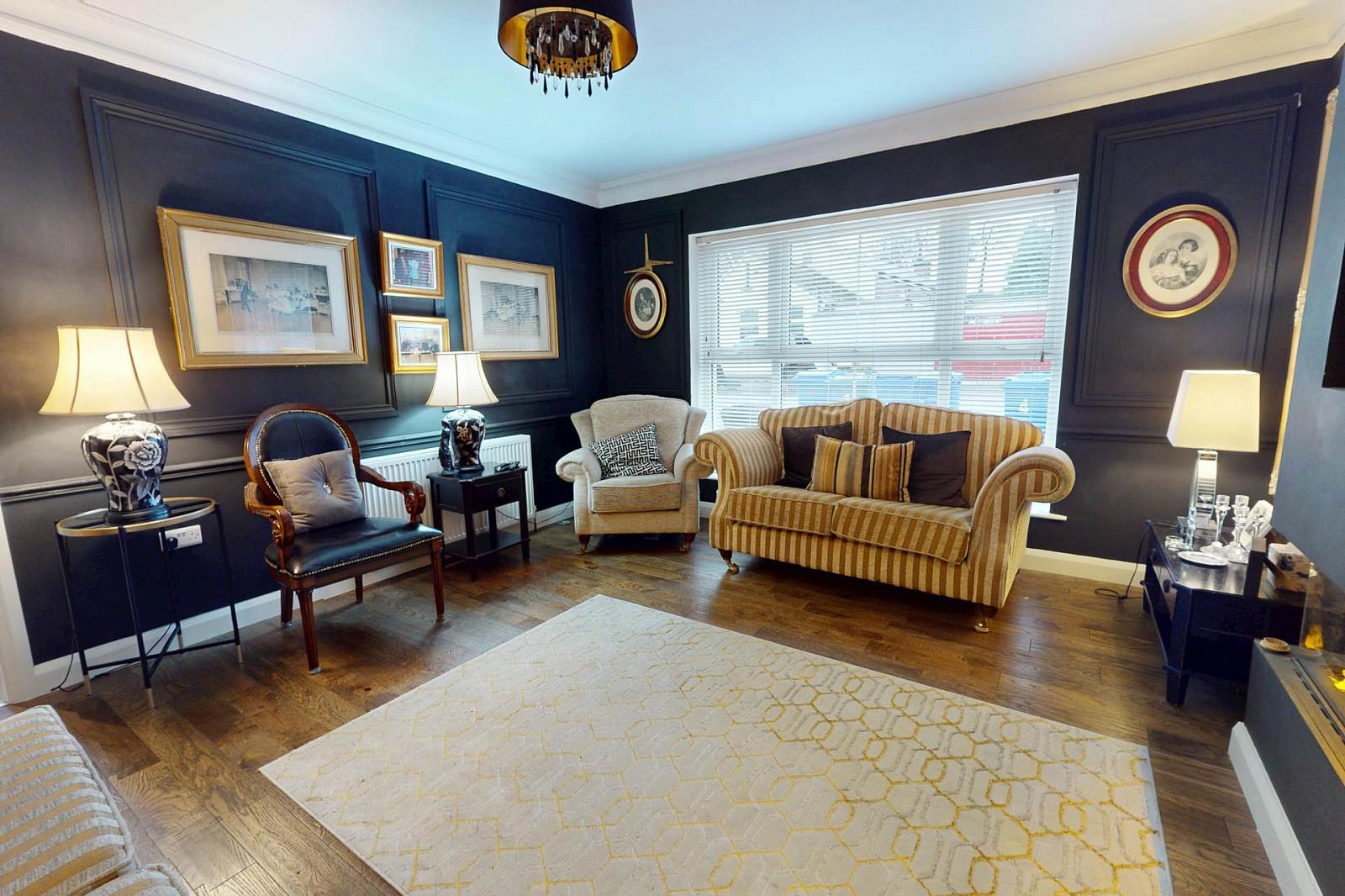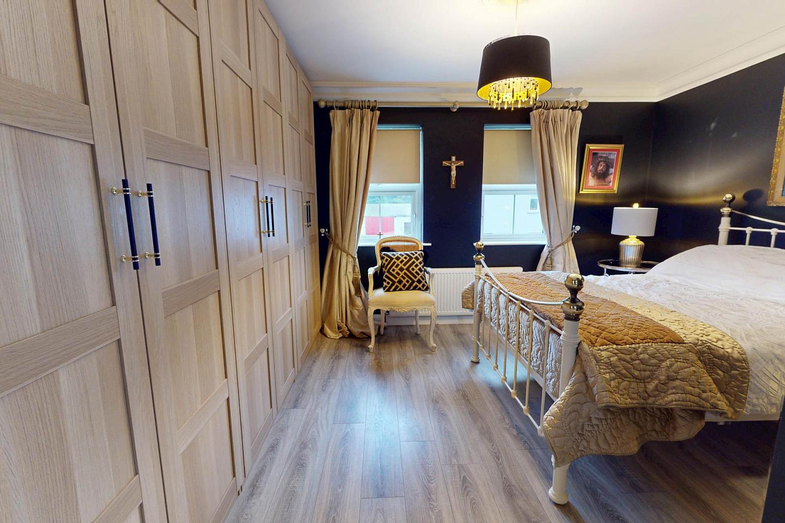 This three-bedroom residence blends contemporary style with thoughtful detailing. Bespoke panelling greets you in the entrance hallway and continues into the living room, where dark-painted walls, ceiling coving, and a sleek electric fireplace create a striking yet welcoming space. Large windows flood the home with natural light, softened by tailored blinds for privacy and control.