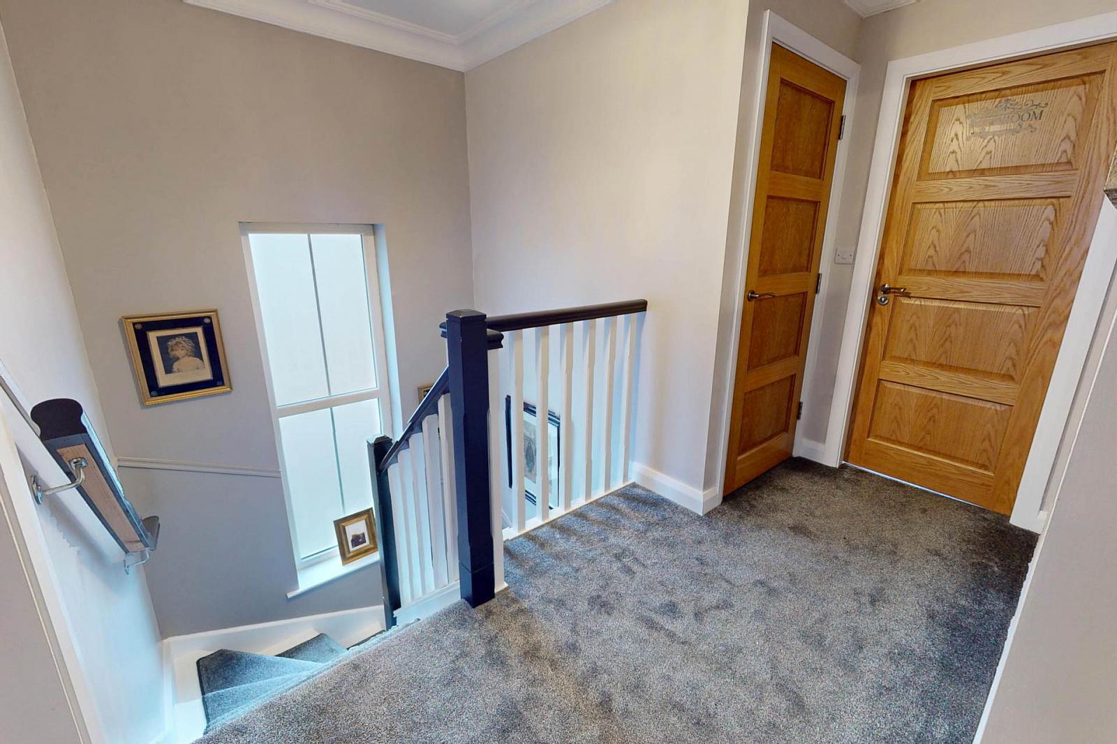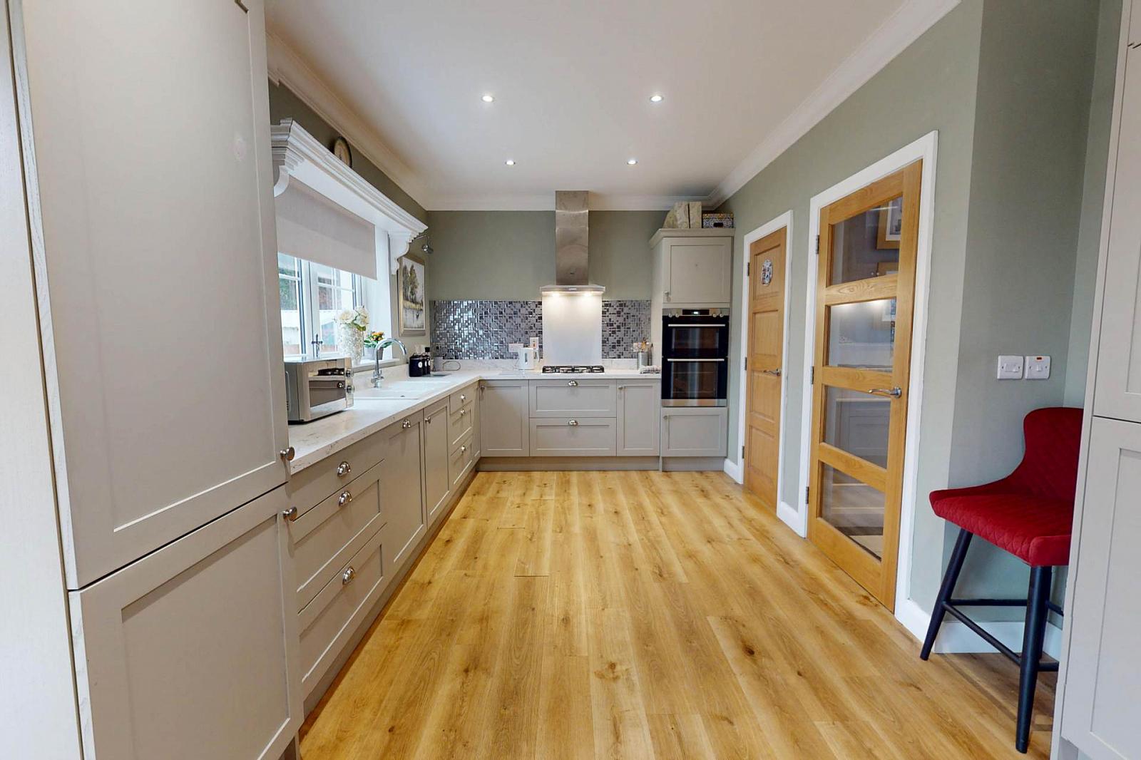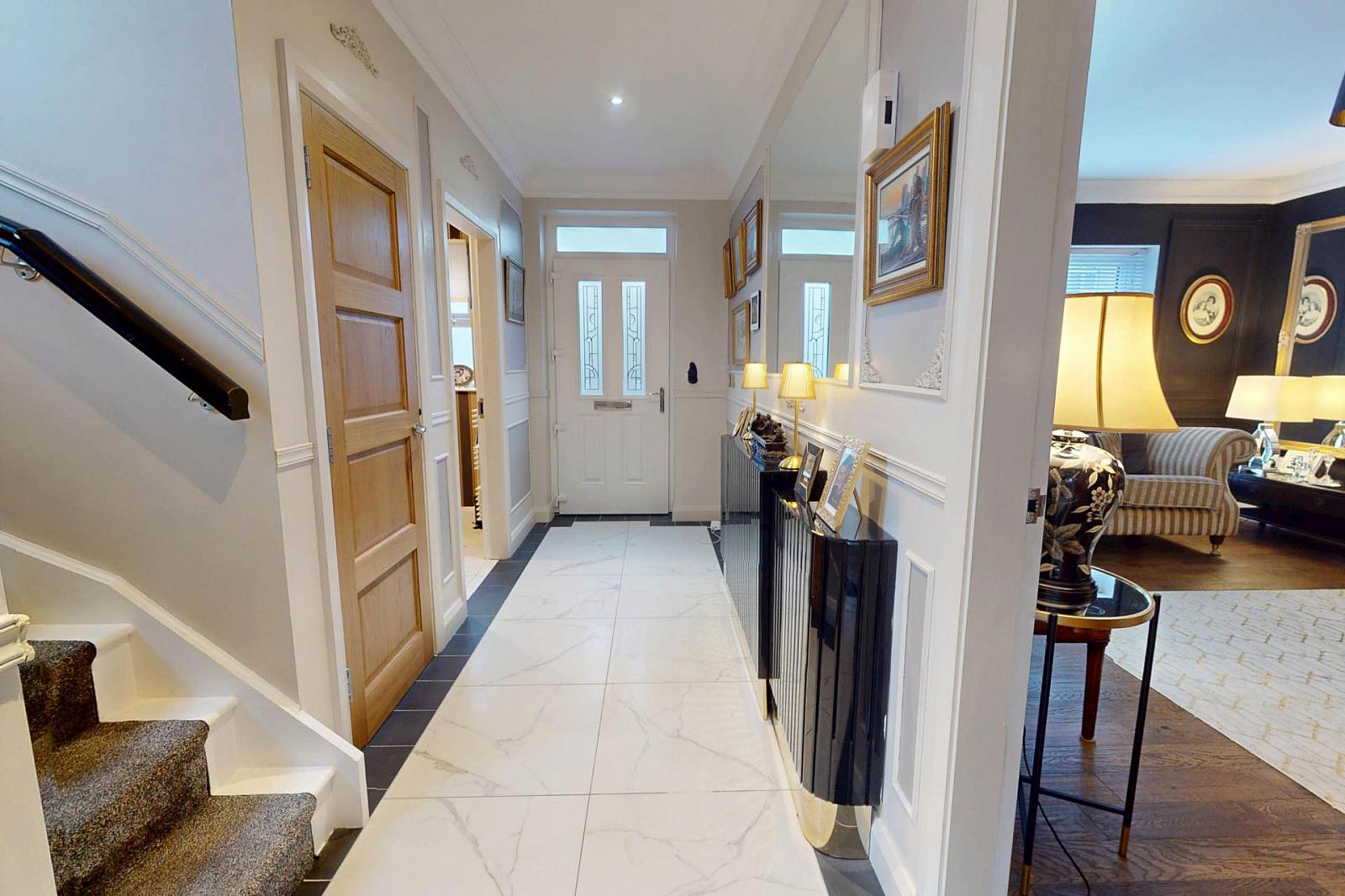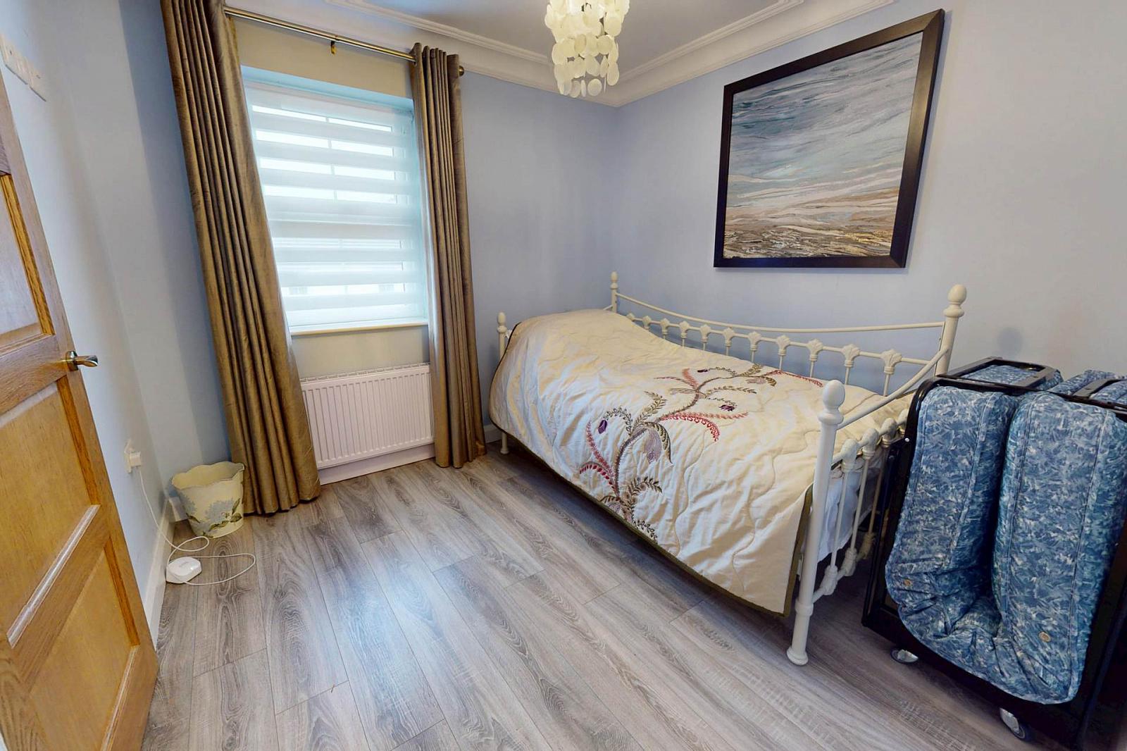 This three-bedroom residence blends contemporary style with thoughtful detailing. Bespoke panelling greets you in the entrance hallway and continues into the living room, where dark-painted walls, ceiling coving, and a sleek electric fireplace create a striking yet welcoming space. Large windows flood the home with natural light, softened by tailored blinds for privacy and control.