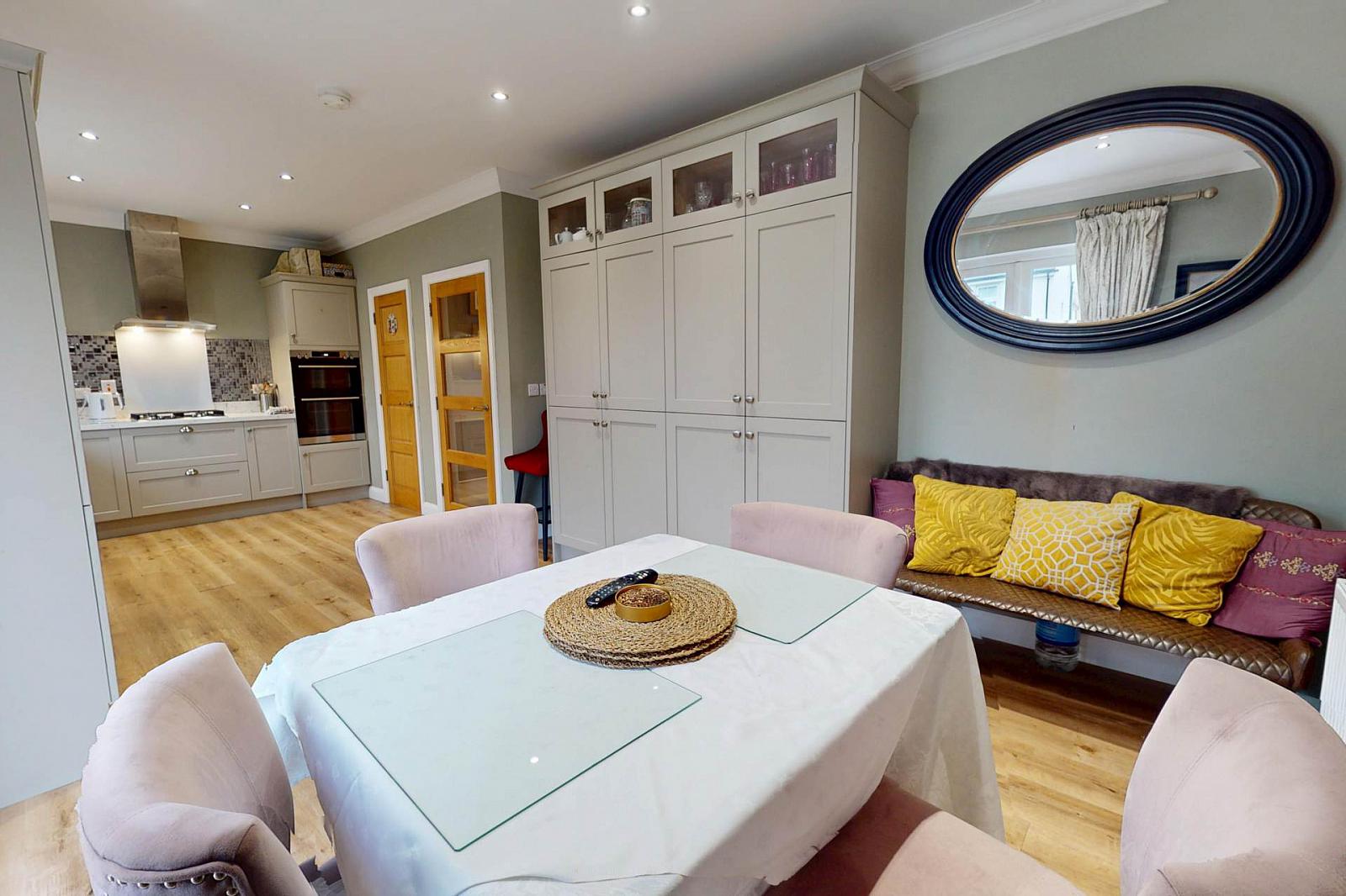 The open-plan kitchen and dining area is both functional and stylish, with sleek cabinetry, premium appliances, warm wooden floors, and double doors to the rear garden. A stylish downstairs WC completes the ground floor.