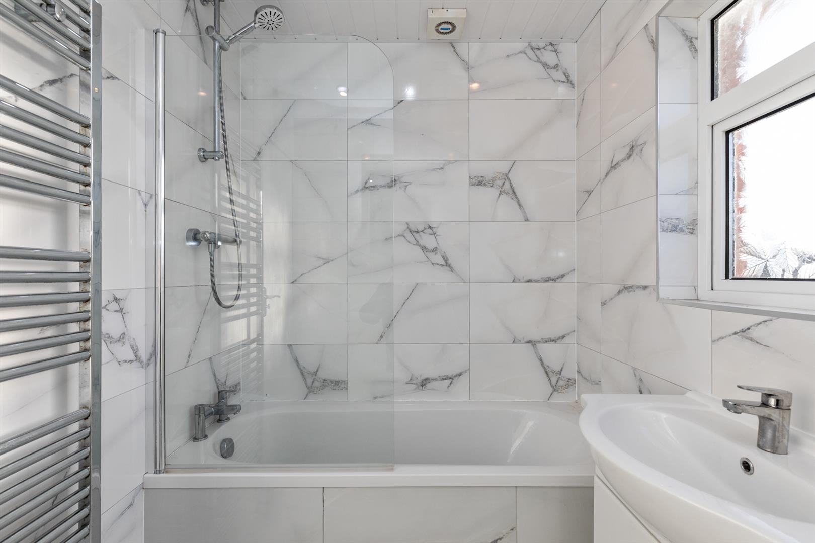 Modern white suite comprising: Bath with tiled panelling and mixer tap, built in shower and shower screen. Vanity unit with mixer tap, low flush WC, fully tiled walls, ceramic tiled flooring and PVC panelled ceiling with recessed spotlights. Feature chrome wall mounted radiator, extractor fan.