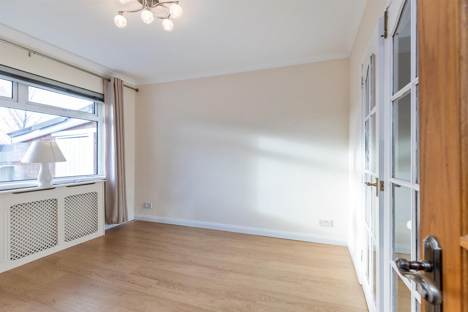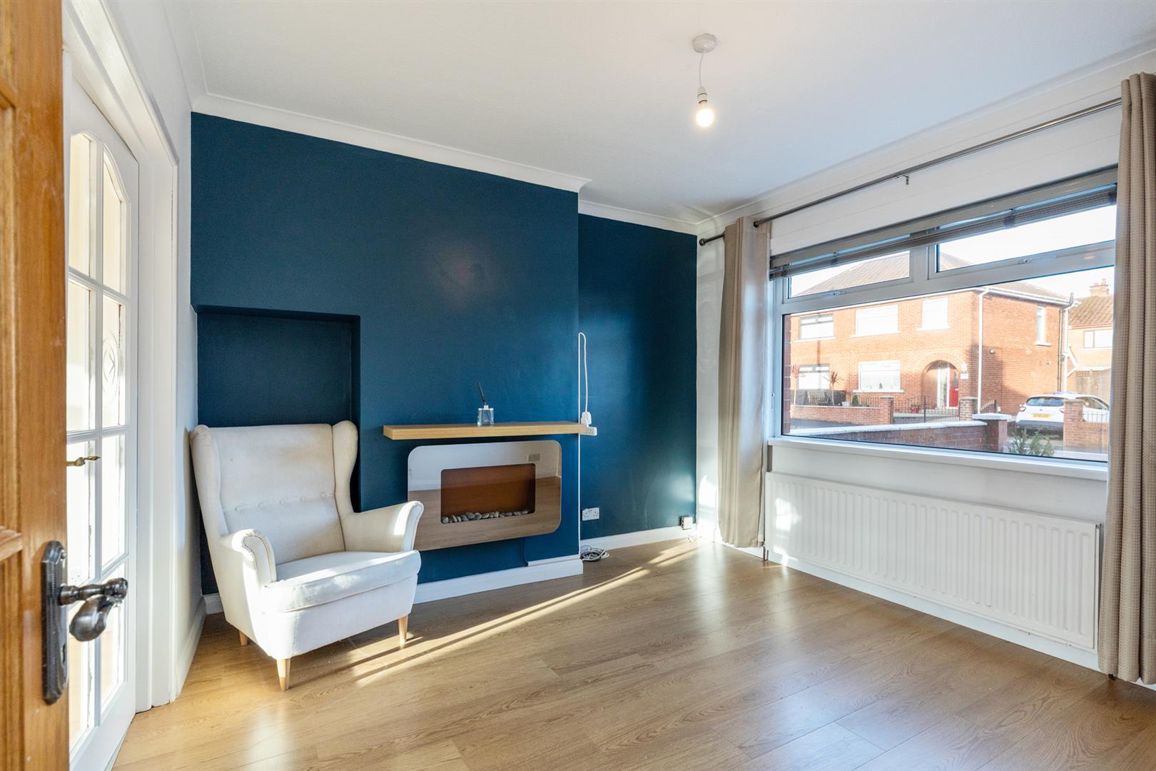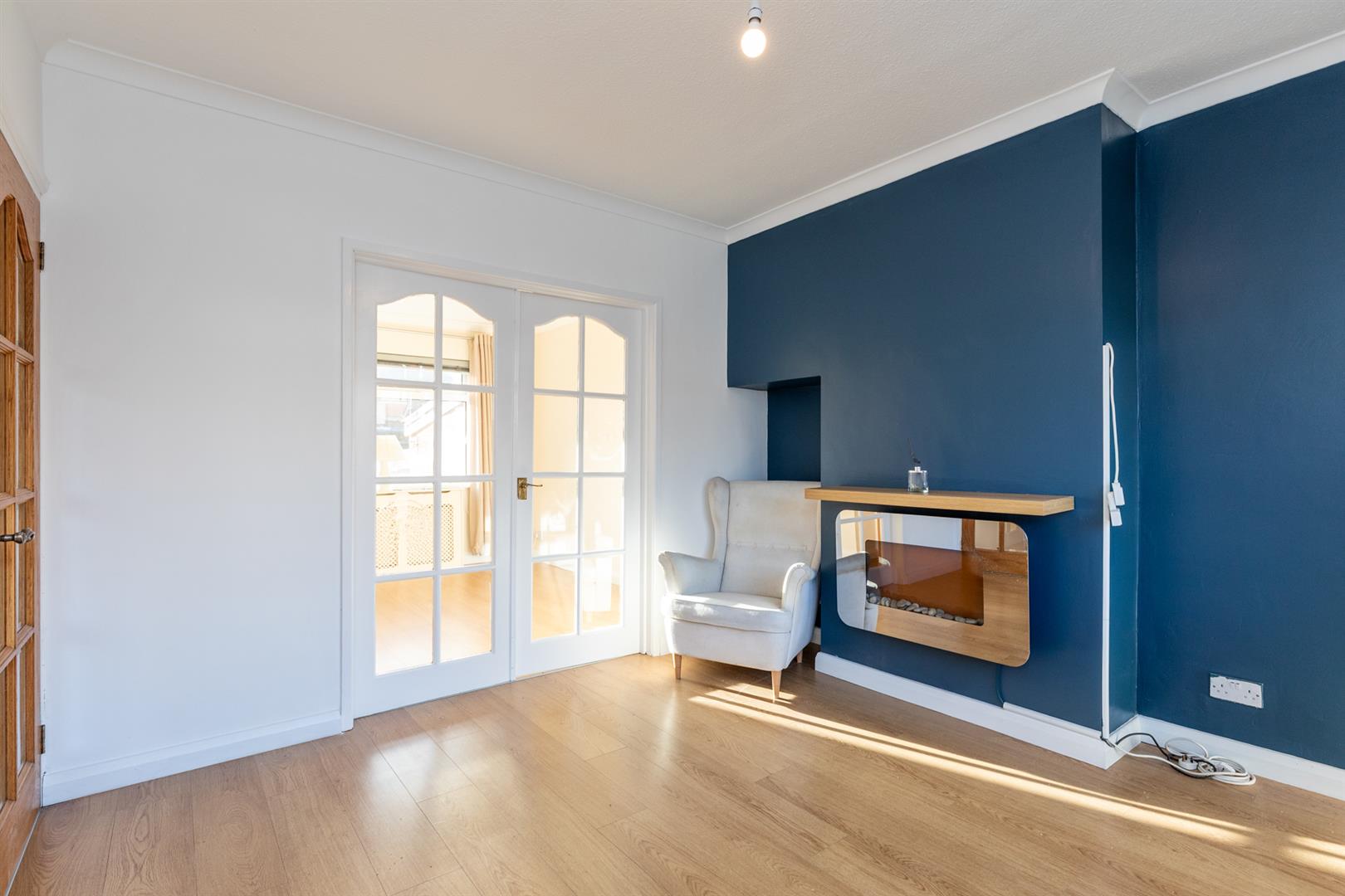 Attractive wall mounted electric fireplace, wood laminate flooring, doors to: