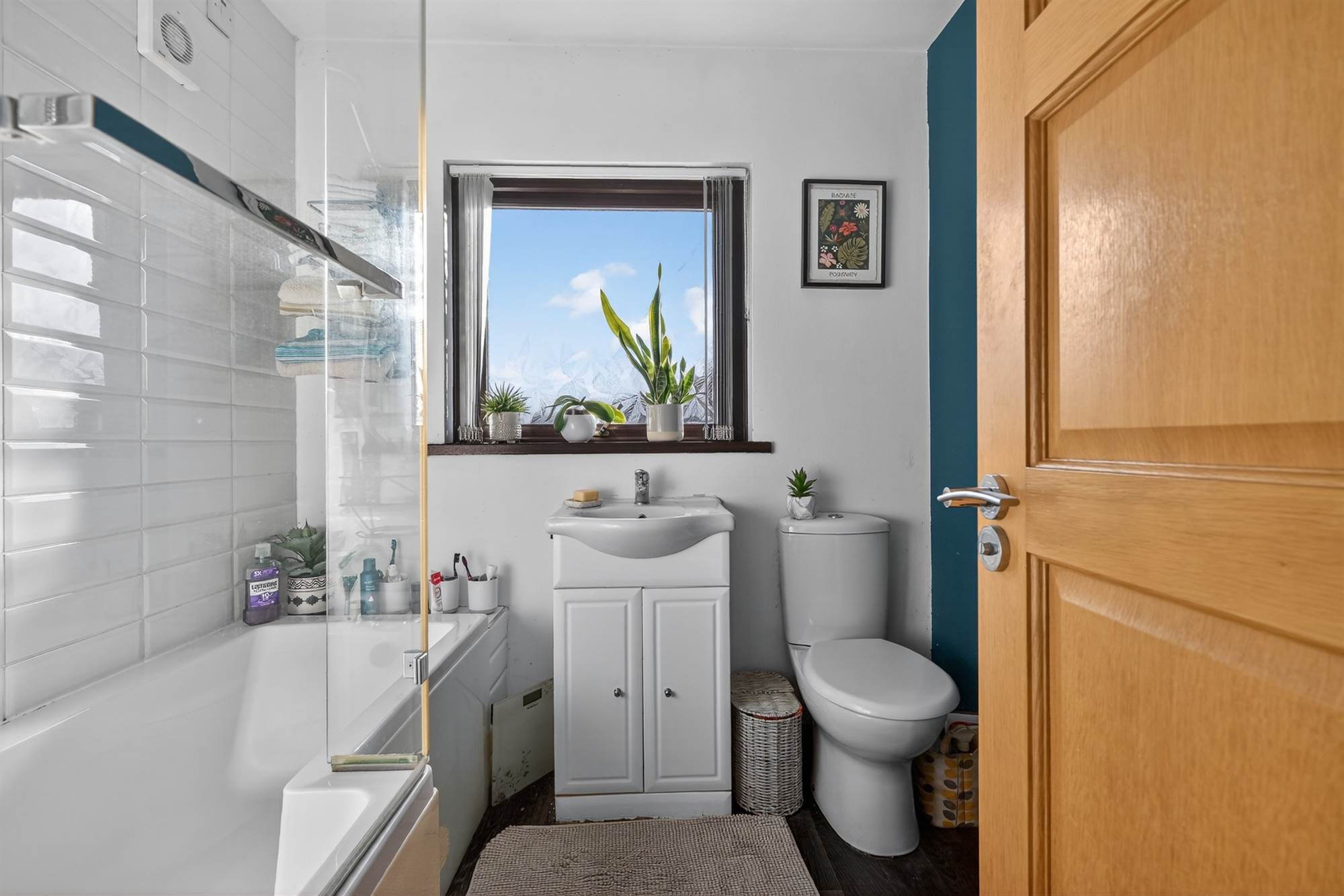 White suite comprising dual flush wc, vanity unit with ceramic sink and mixer tap. Panelled bath with thermostatic shower and glass screen. Part-tiled walls.