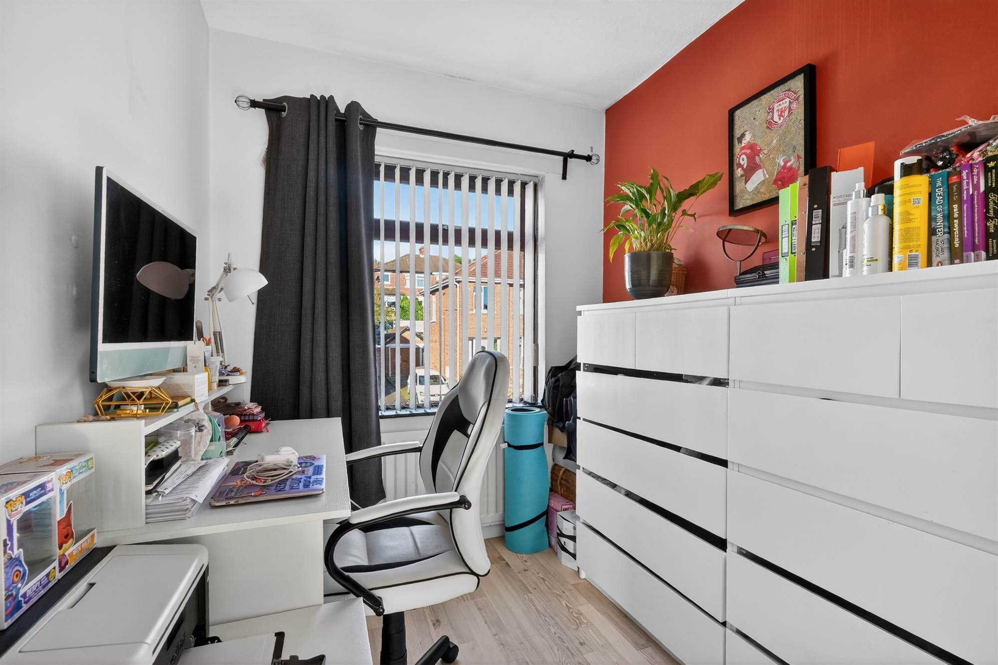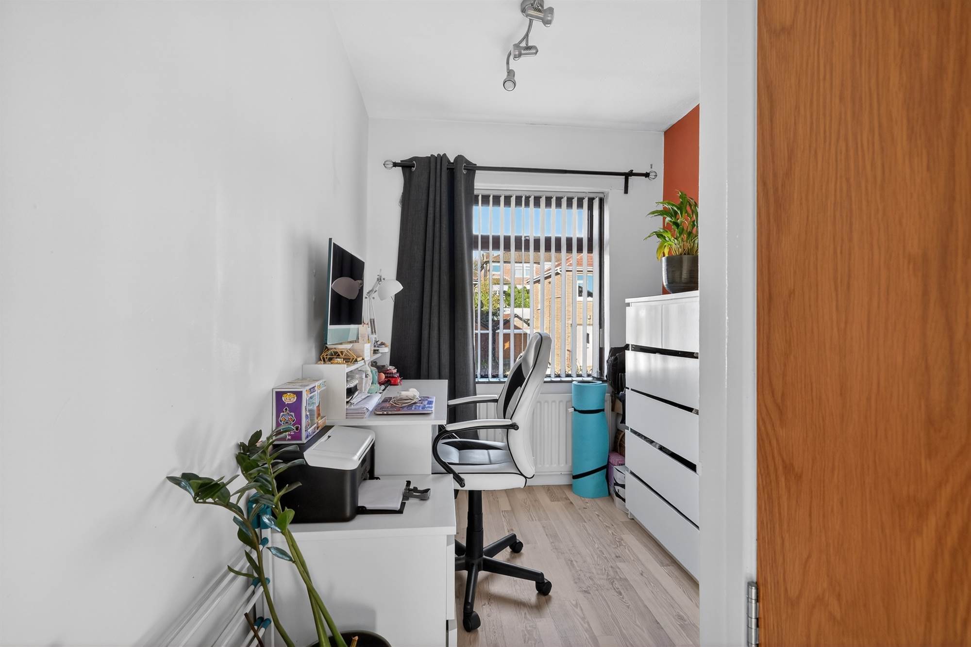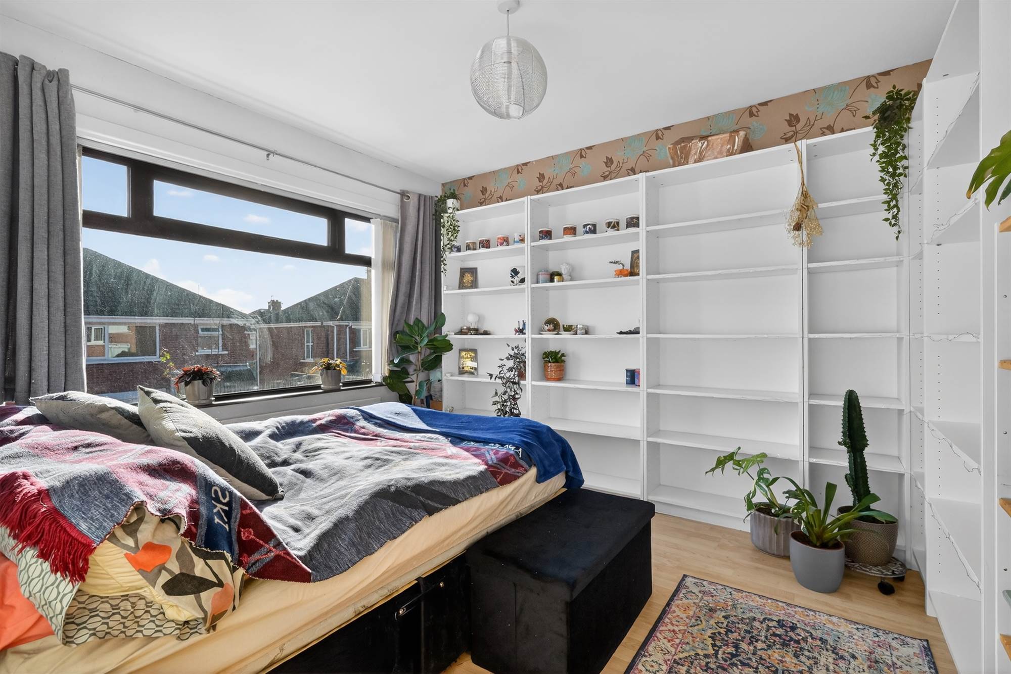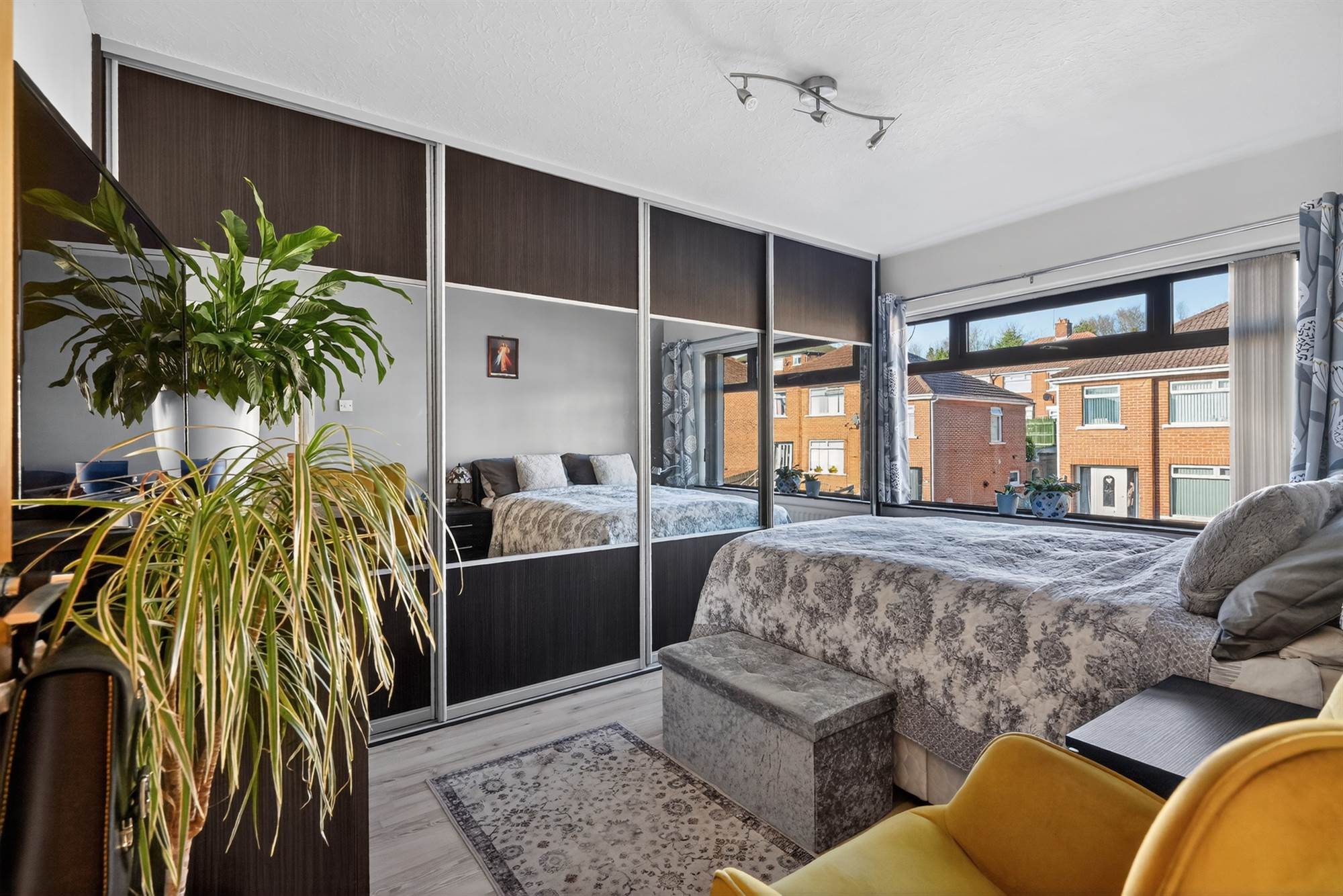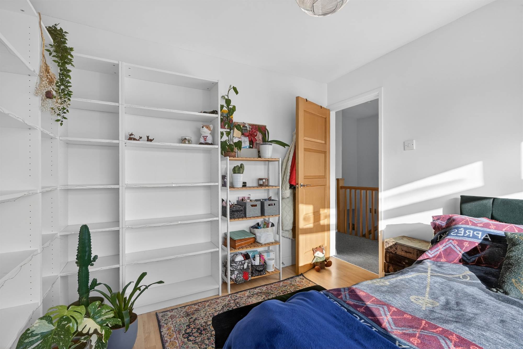 Wood effect flooring. Walll to wall built-in wardrobe storage.