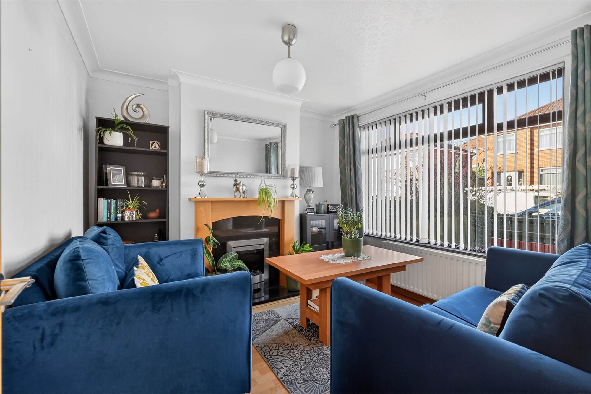 Living room to front with feature fireplace