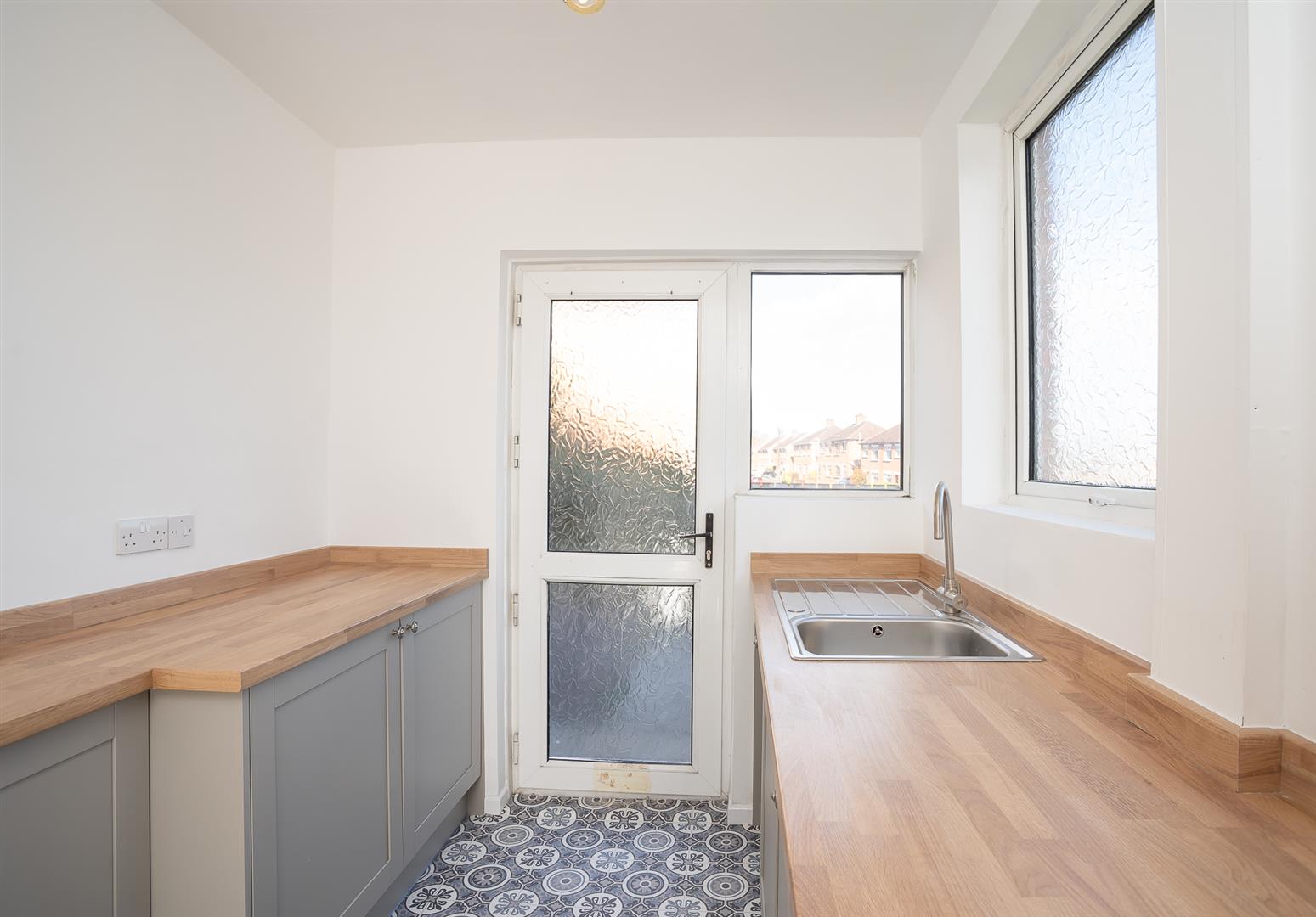 A stylish galley-style kitchen with a laminate worktop, induction hob, and oven with direct access to the rear patio