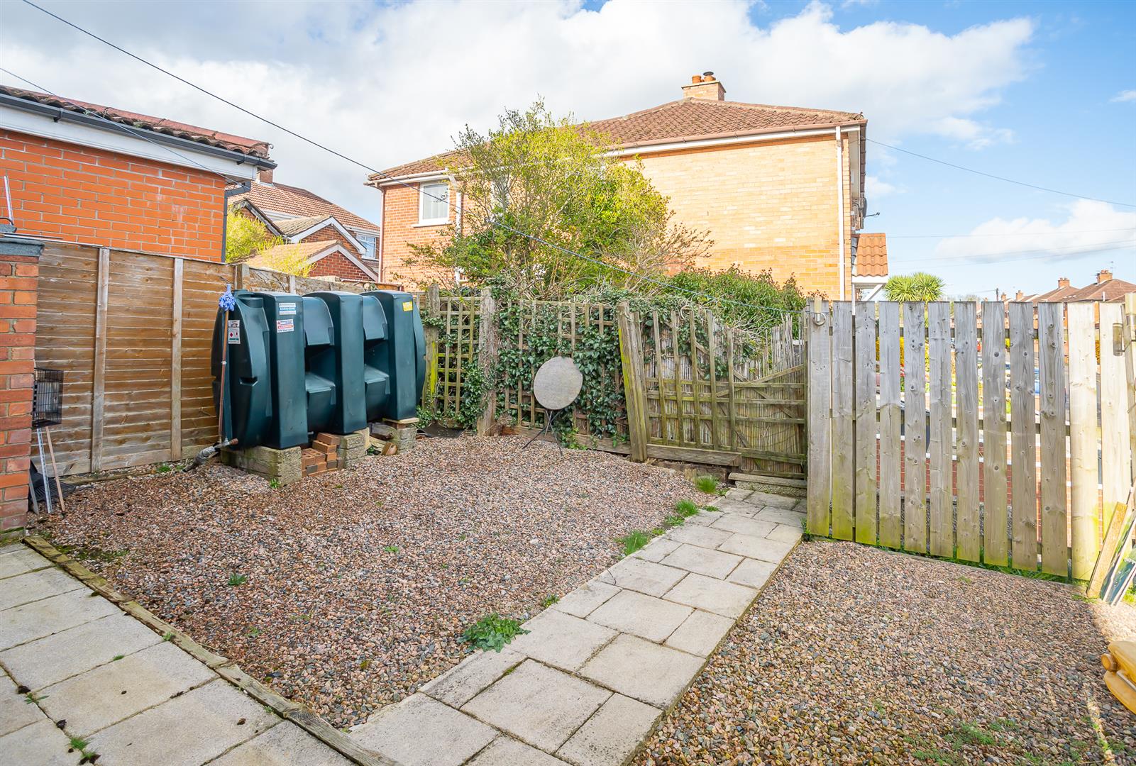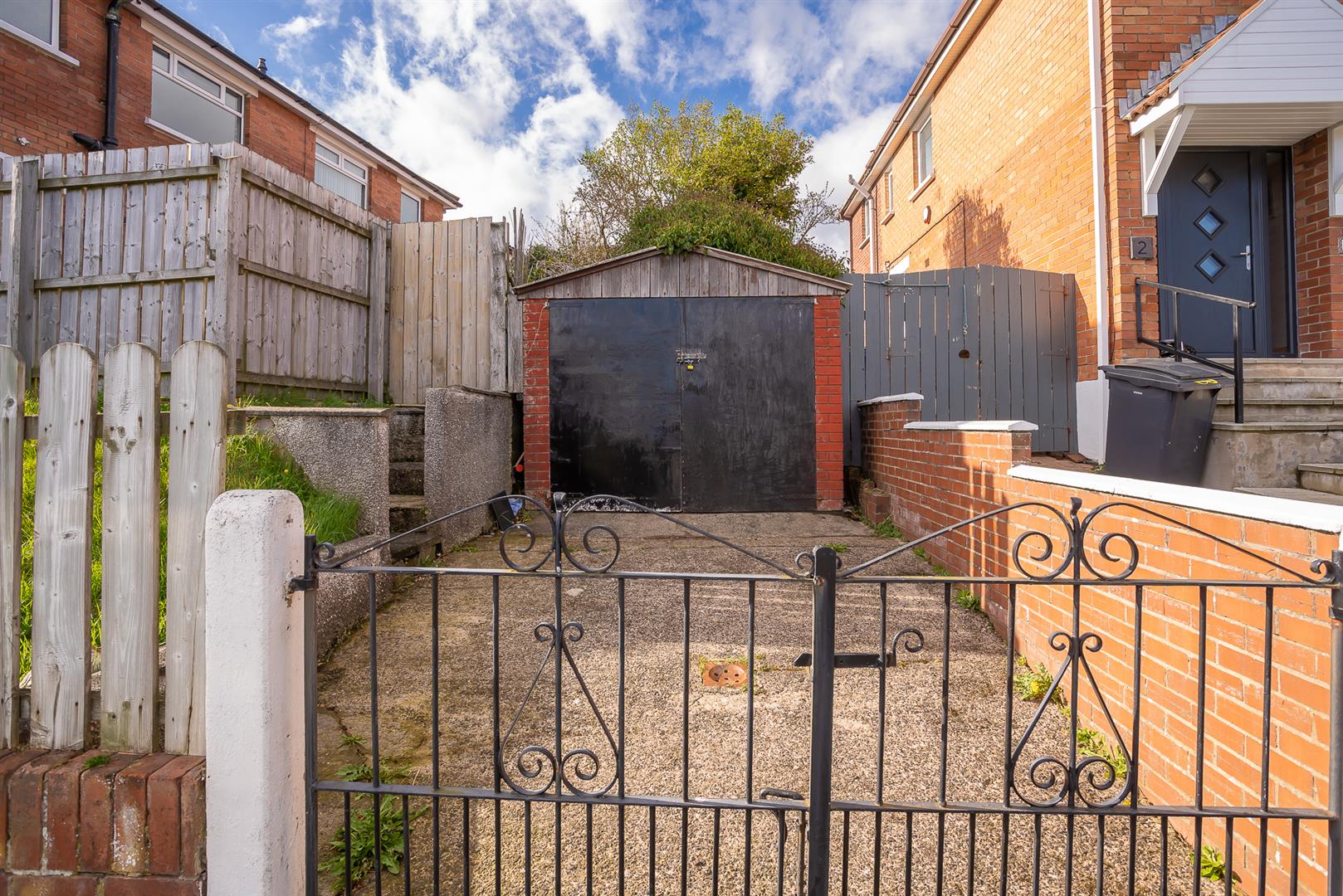 The property is accessed via steps leading to the front door. There is a good-sized garden to the front and at the side of the property, with a secure patio area with detached garage and driveway to the rear.