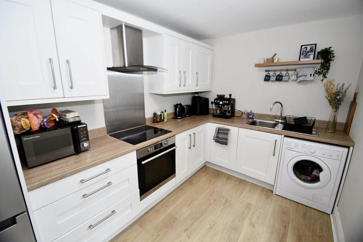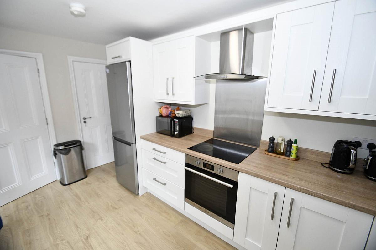 Modern fitted kitchen with a range of high and low level units, wood effect formica work surfaces, stainless steel sink drainer, ceramic hob with built in oven and stainless steel splash back and overhead stainless steel extractor fan. space for fridge freezer, plumbed for washing, under stairs storage, laminate flooring, access to rear