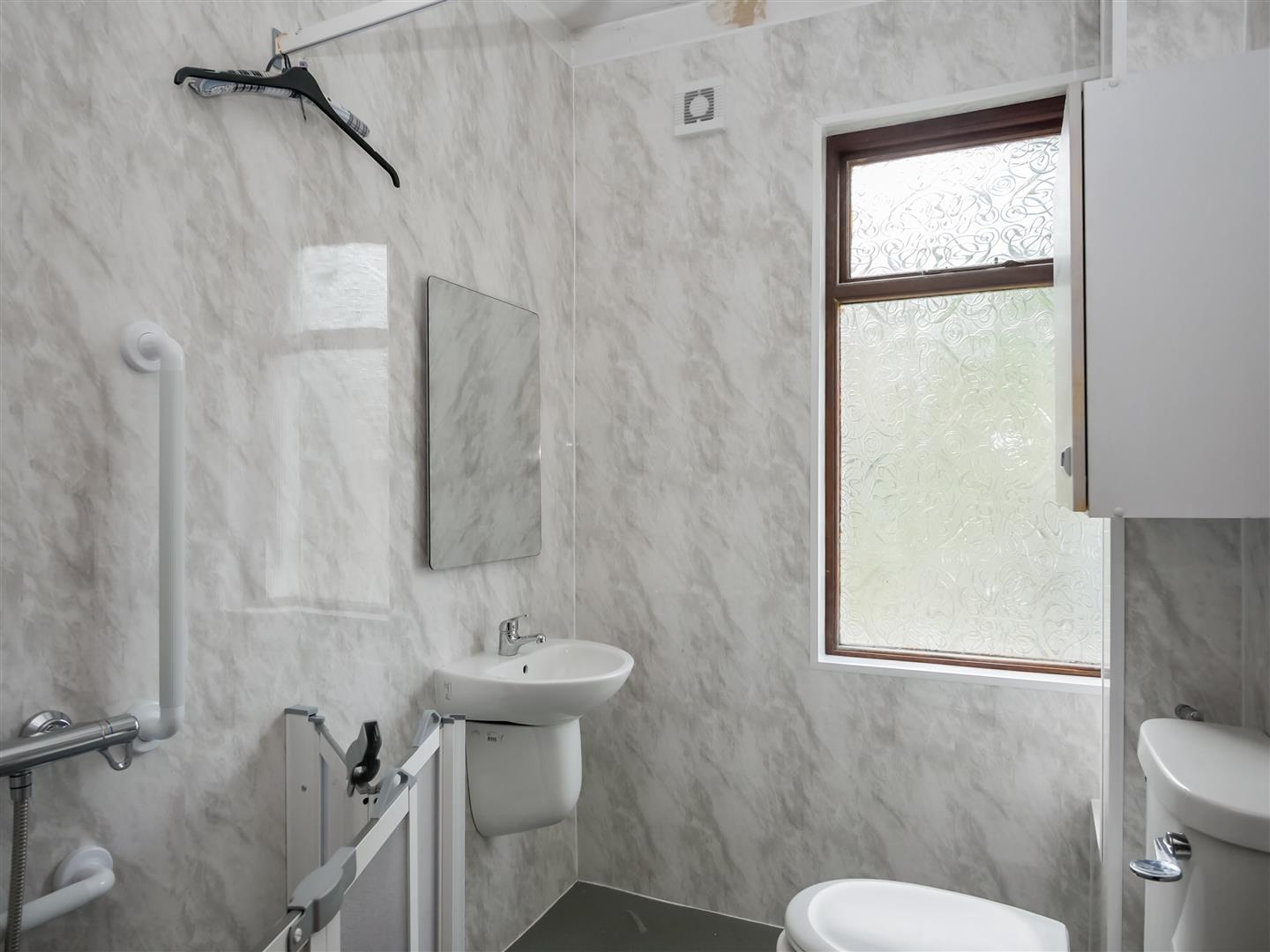 Walk in shower, pedestal wash hand basin with mixer taps, low flush w.c Pvc walls. Non slip flooring.
