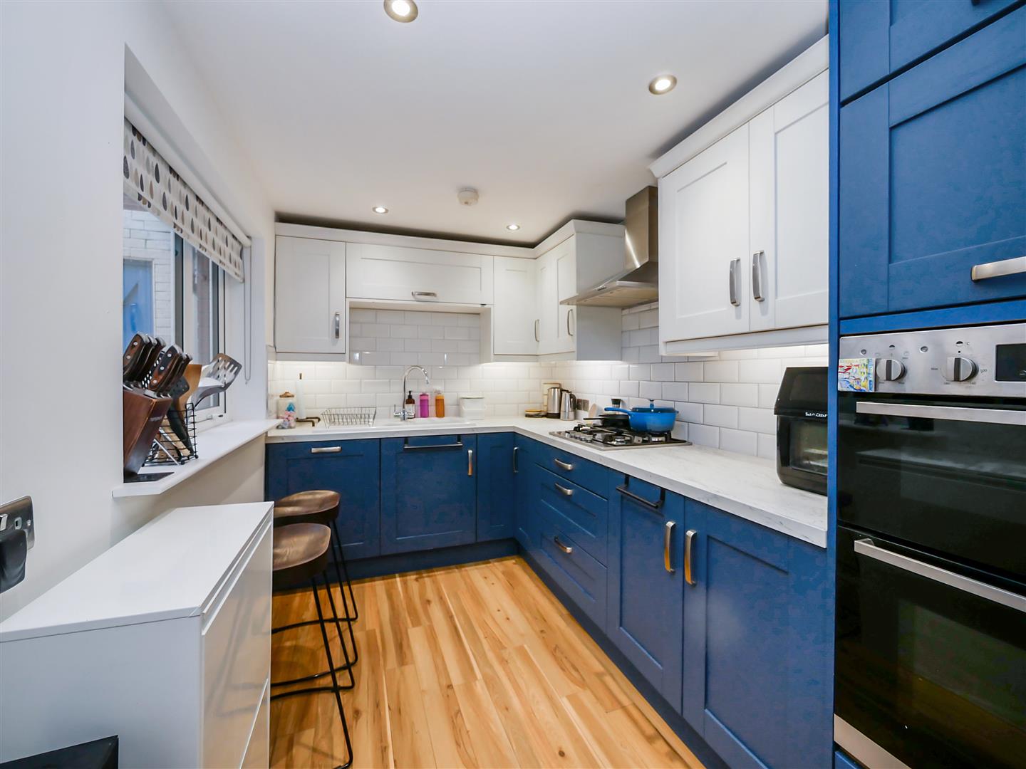 Modern fitted kitchen with a range of two tone units, single drainer 1 1/4 bowl sink unit with mixer taps, work surfaces, part tiled walls, extractor canopy, 4 ring gas hob and double oven, integrated dishwasher & fridge / freezer, recessed spotlights, laminate flooring.
