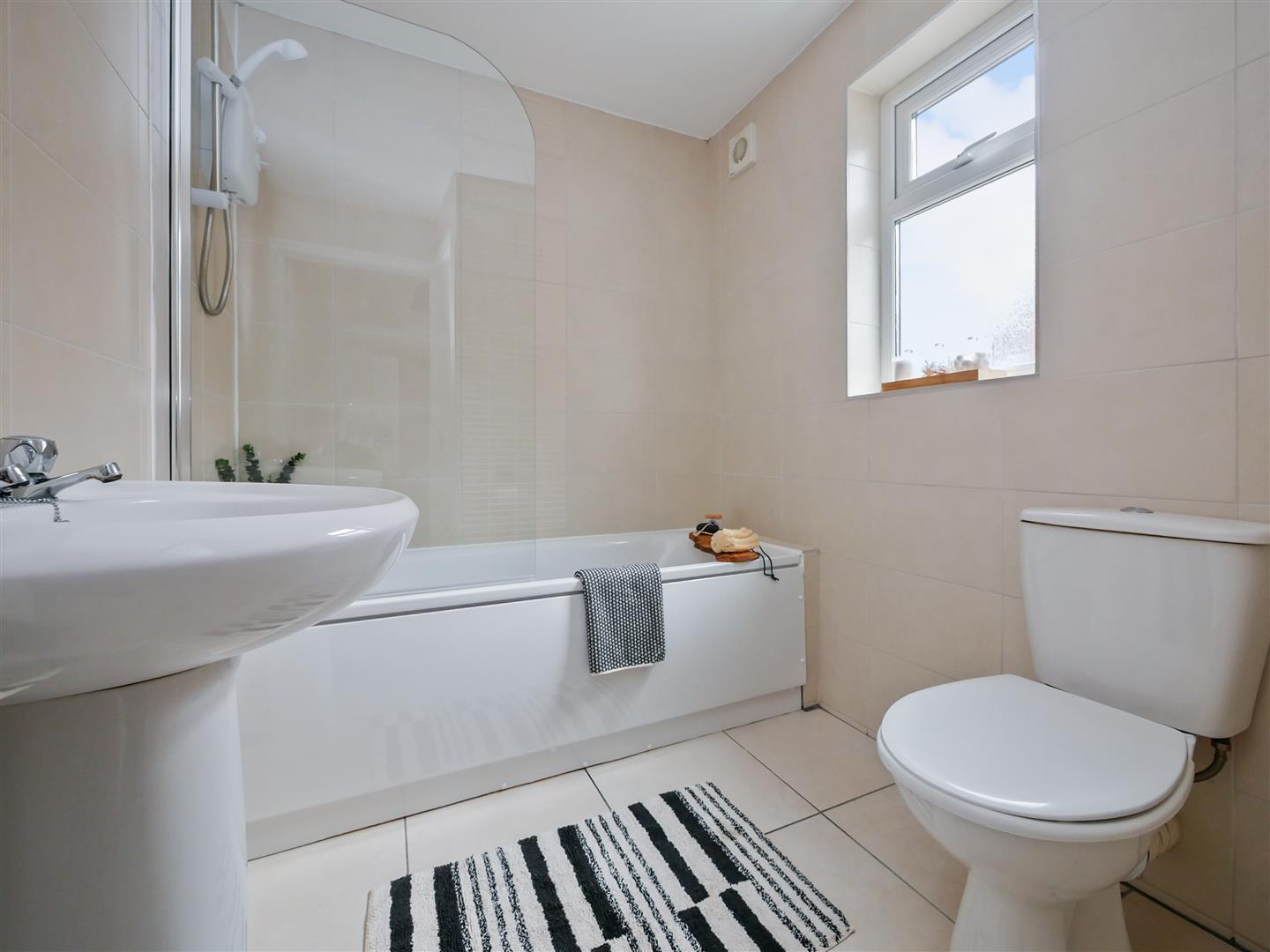 Modern white suite comprising panelled bath with electric shower above, Low flush w/c, pedestal wash hand basin. extractor fan, Fully tiled walls, tiled floor, Gas boiler.