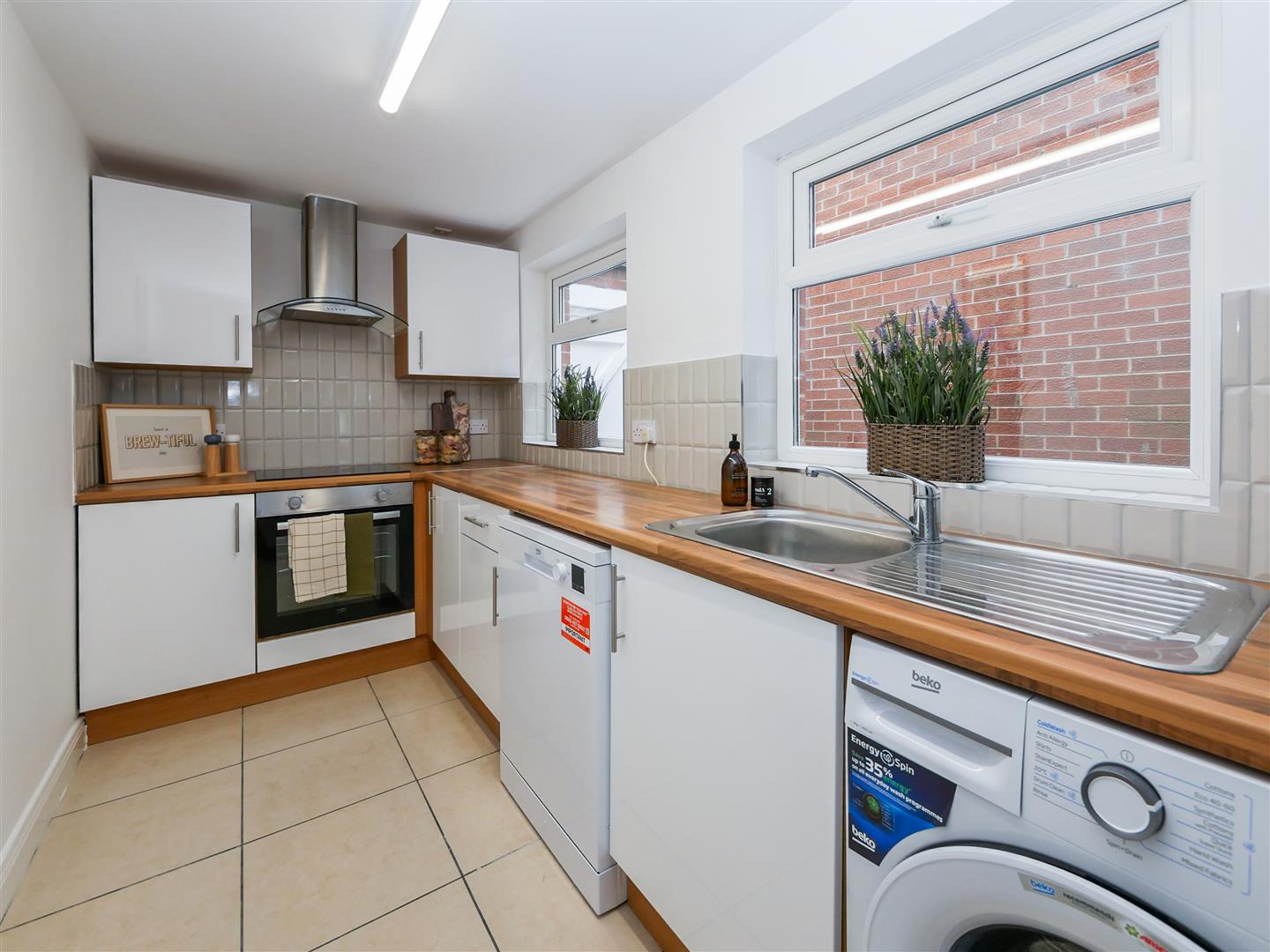 Full range of high and low level units, single drainer sink unit with mixer taps, formica work surfaces, part tiled walls, 4 ring hob and under oven, extractor fan, the freestanding fridge freezer, washing machine and dishwasher all of which are brand new will be included. Tiled floor.