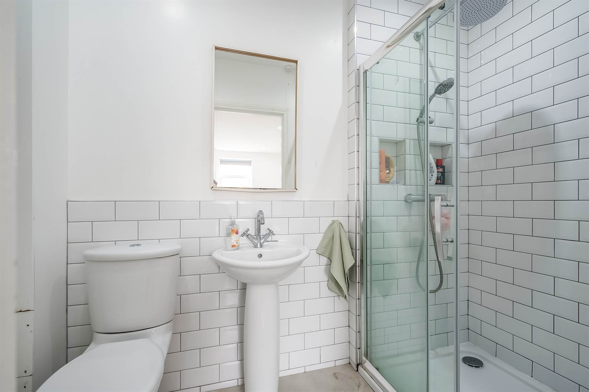 Fully tiled walls in shower cubicle with thermostatically controlled shower cubicle, pedestal wash hand basin, low flush wc.