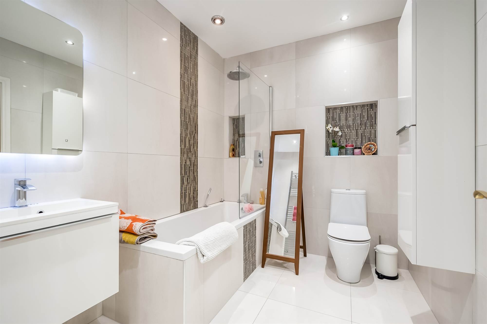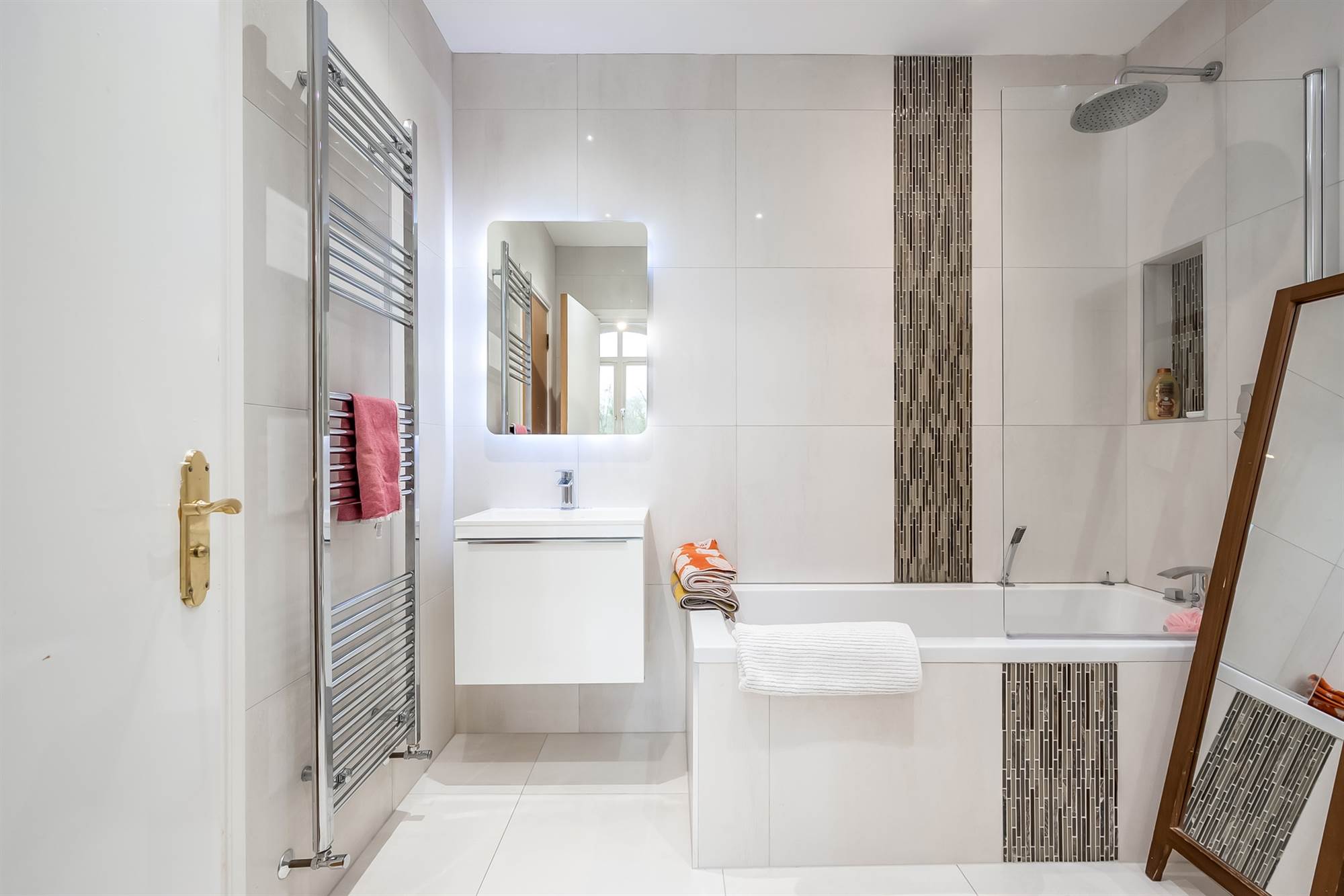 Panelled bath with overhead shower, floating wash hand basin with under storage, low flush wc, LED mirror, chrome heated towel rail, fully tiled, medicine cabinet, extractor fan. Door to: