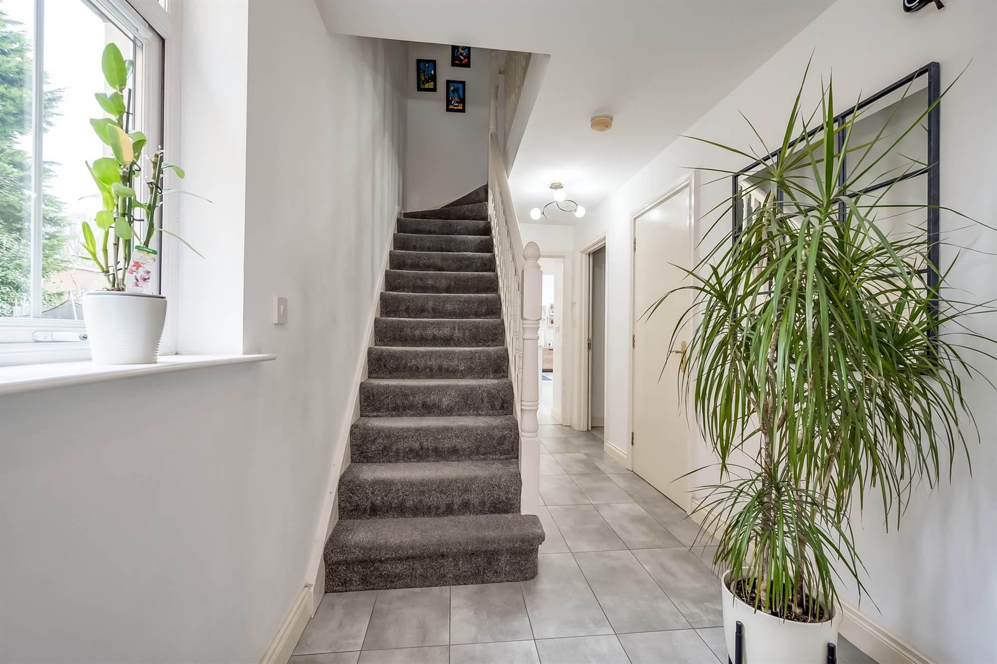 Composite front door, feature ceramic floor tiling, under stairs cloaks cupboard.