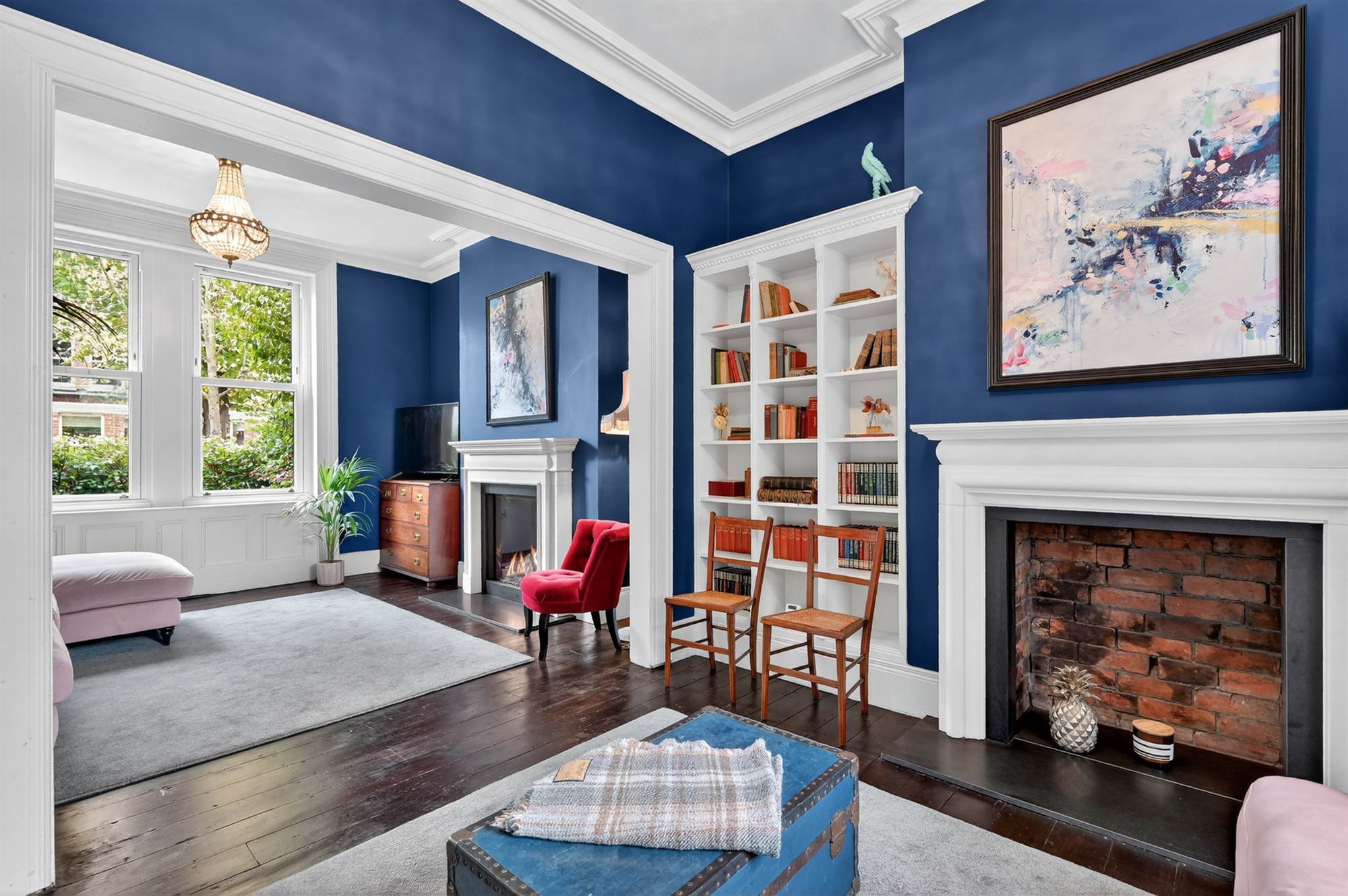 Feature sandstone fireplace with tiled hearth, cornice ceiling, built-in wardrobe.