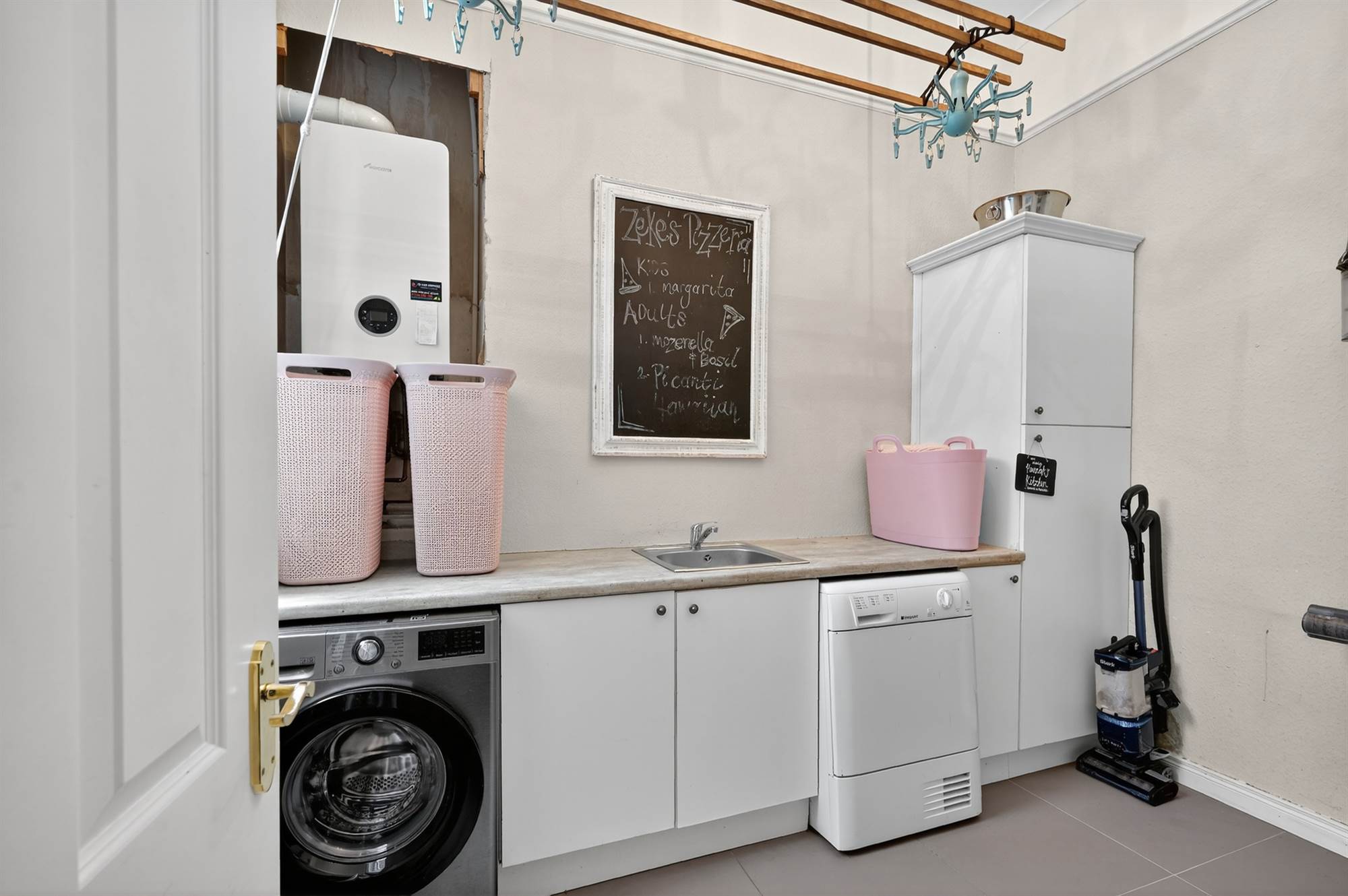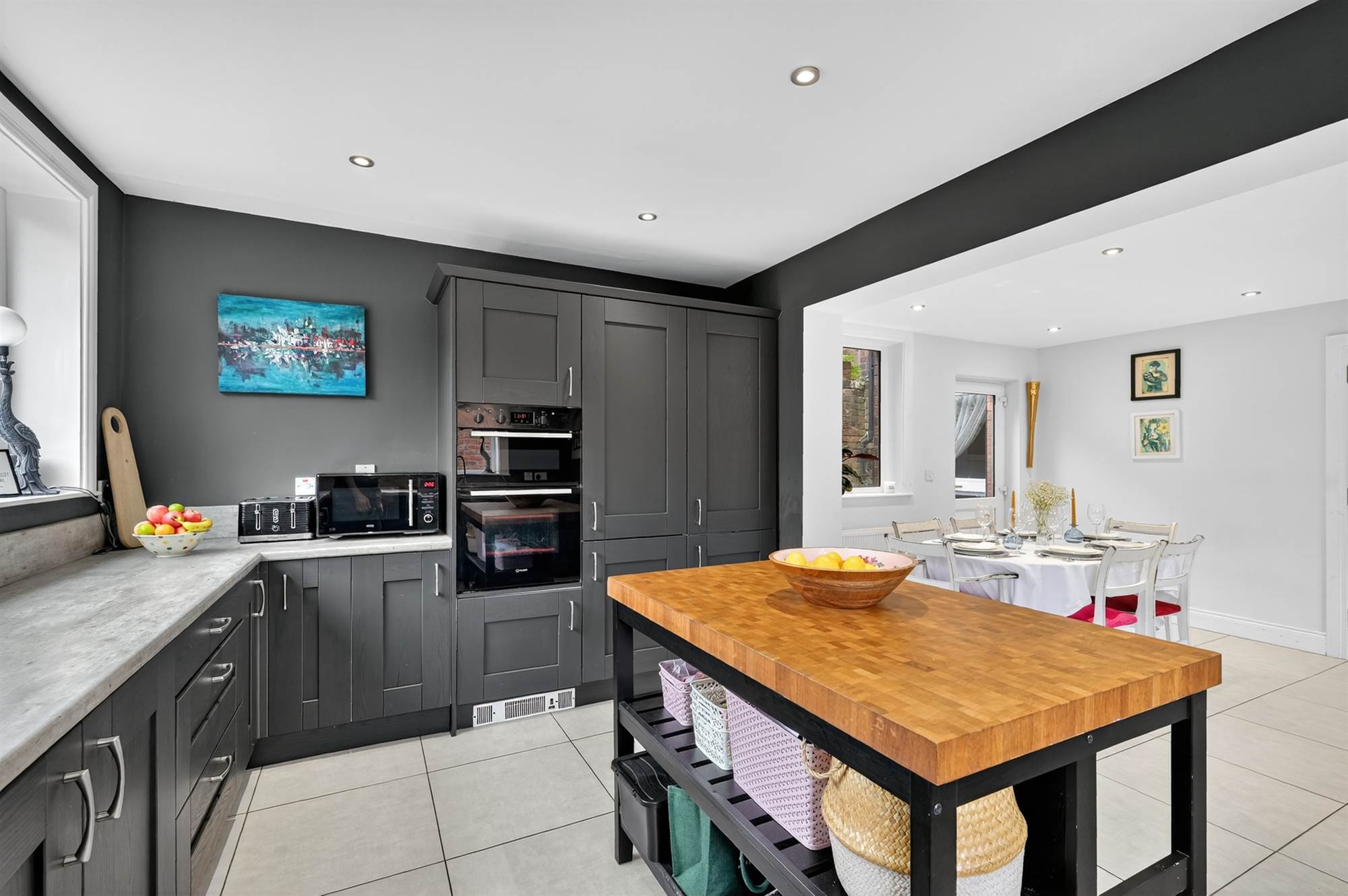 Units, plumbed for washing machine, laminate work surfaces, stainless steel sink unit, cornice ceiling, picture rail, ceramic tiled floor.