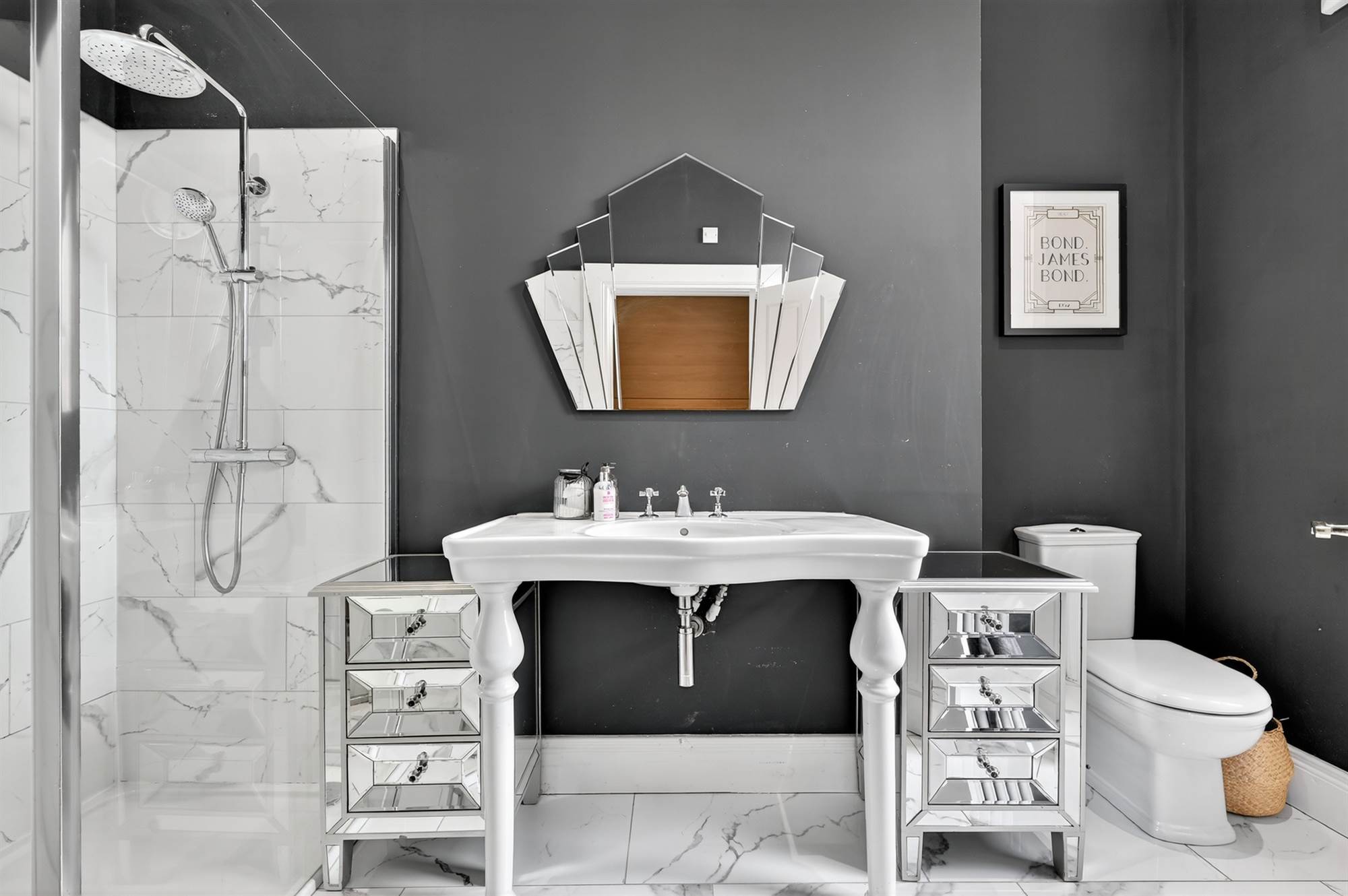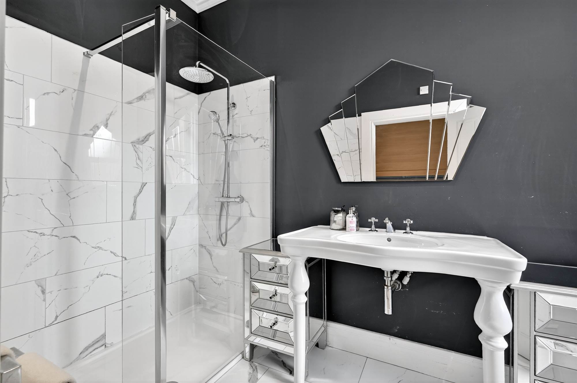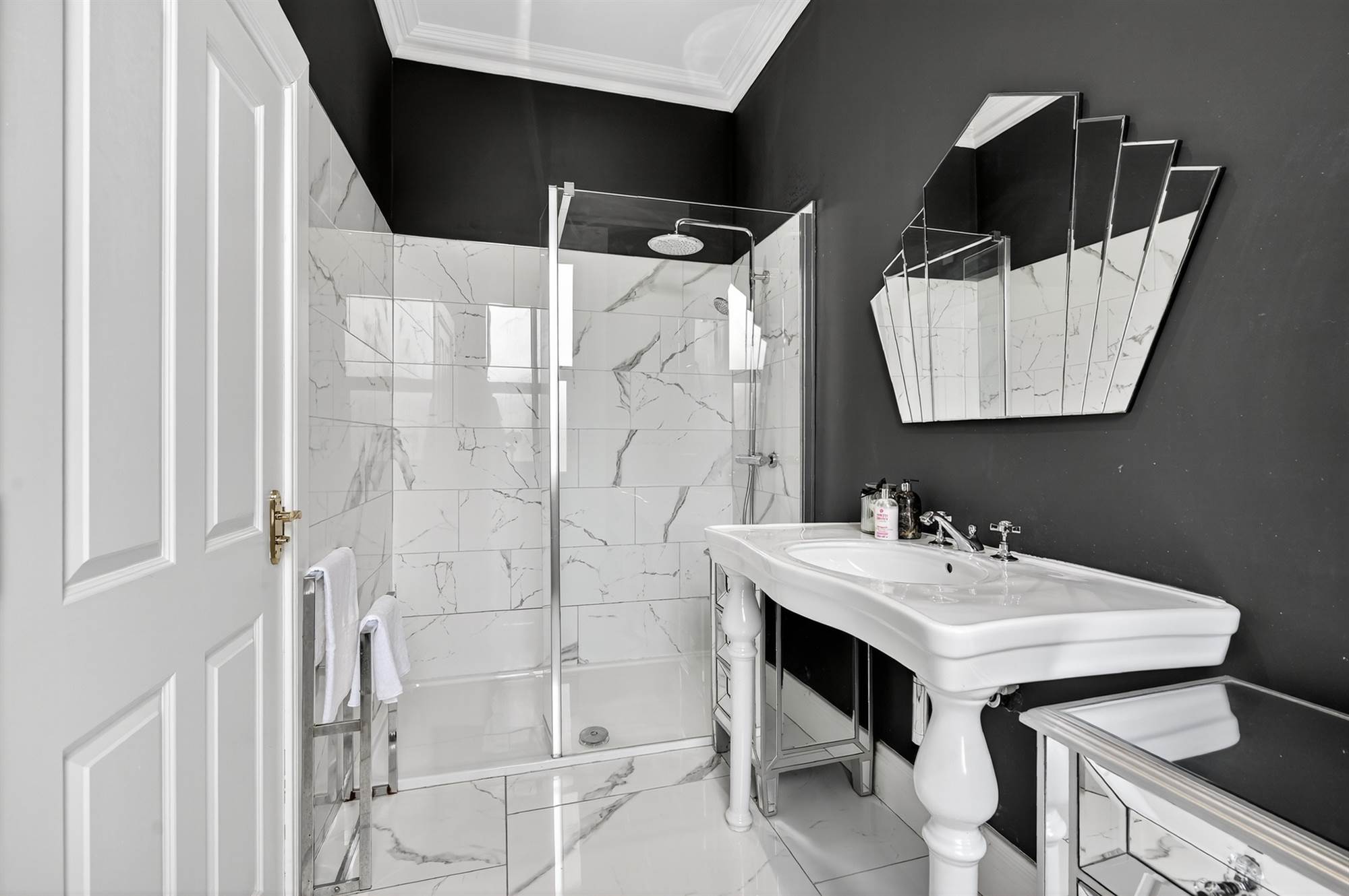 White suite comprising low flush wc, feature vanity unit with wash hand basin, fully tiled shower cubicle wit drying area and drencher shower, feature tiled floor, cornice ceiling, extractor fan.