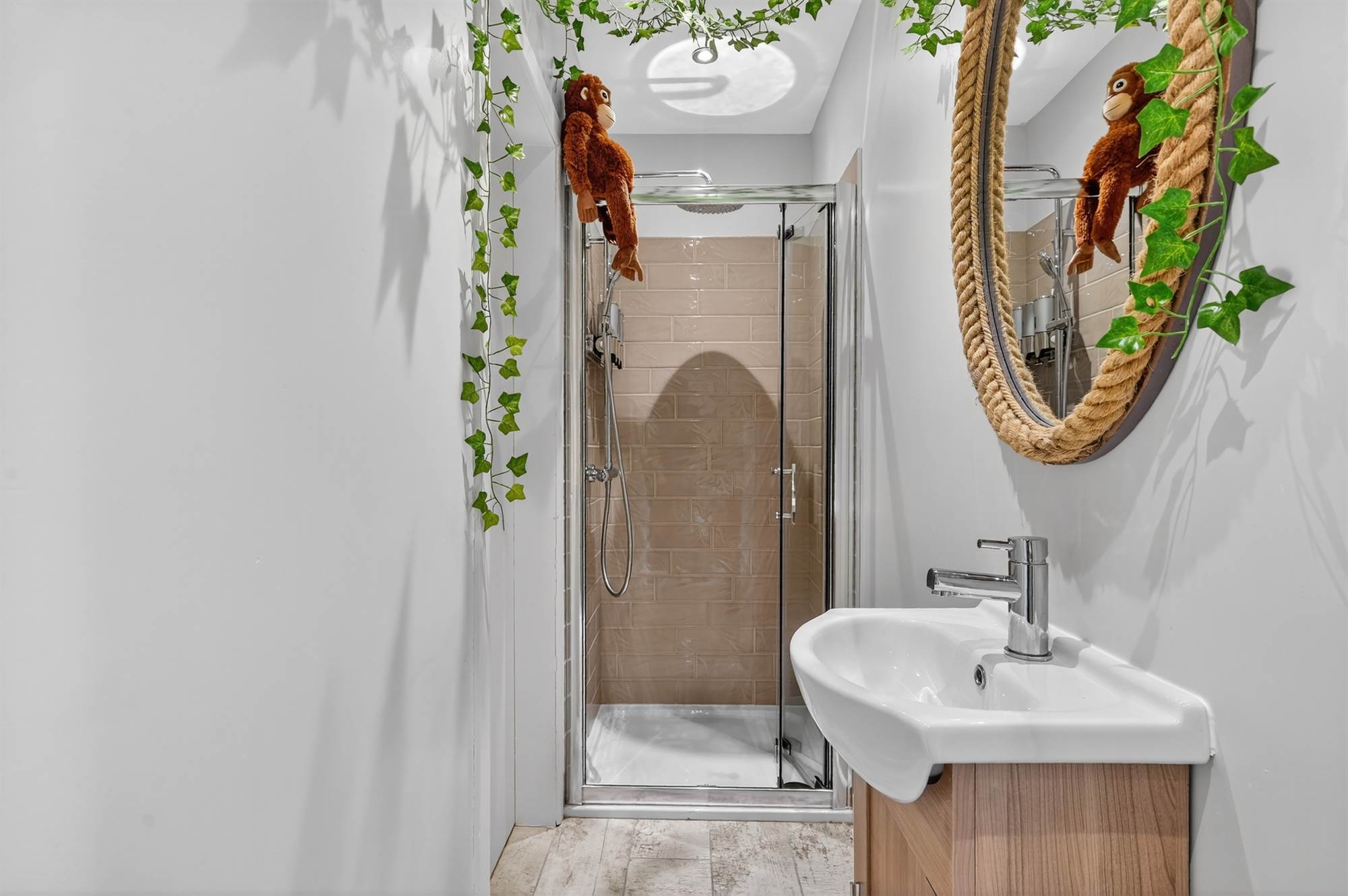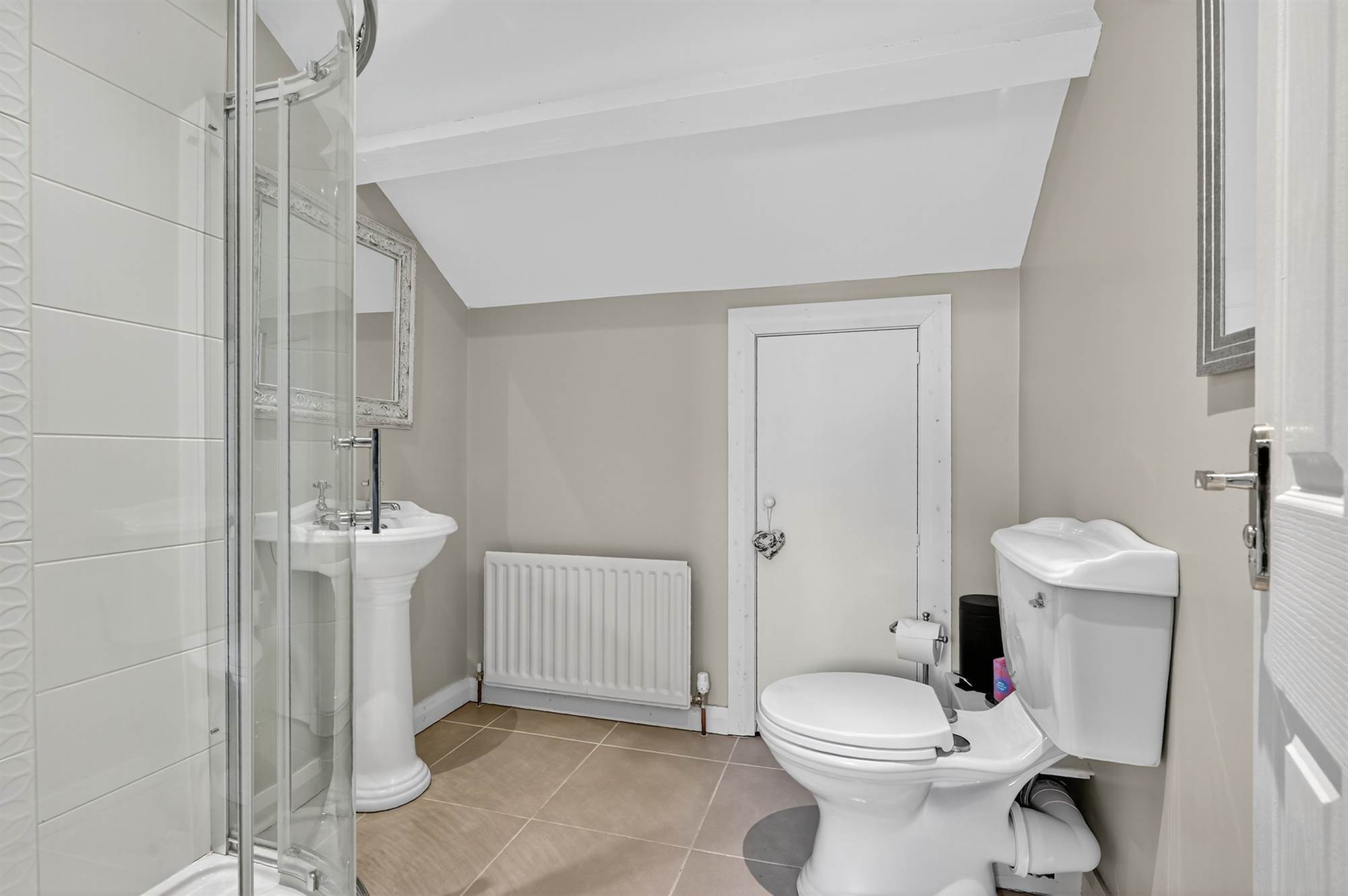 White suite comprising low flush wc, pedestal wash hand basin, fully tiled shower cubicle with drencher shower, low voltage spotlights, extractor fan, ceramic tiled floor, storage into eaves.