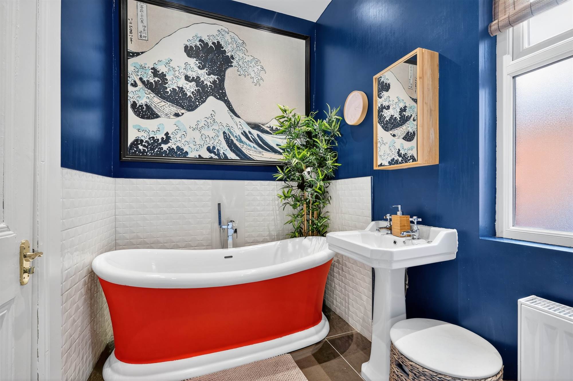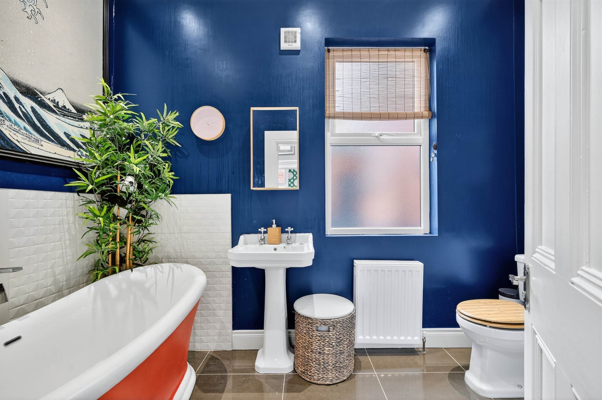 White suite comprising low flush wc, fully tiled shower cubicle and drencher shower head, free standing bath, pedestal wash hand basin, feature tiling, tiled floor, low voltage spotlights, extractor fan, access to roofspace.