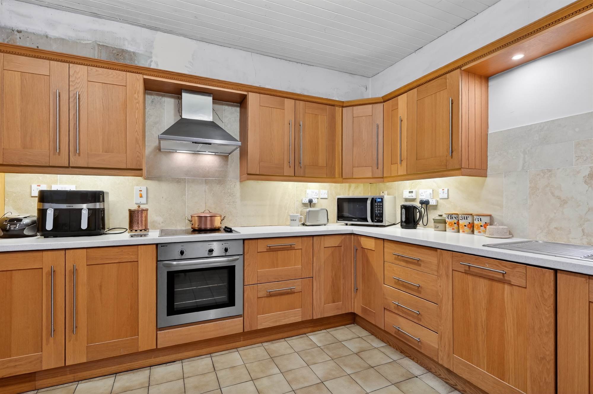 Modern oak fully fitted kitchen with range of high and low level units, Corian worktops, stainless steel single drainer sink and a half sink unit with mixer taps, integrated dishwasher, built-in oven, four ring ceramic hob, extractor fan above, integrated fridge and freezer. Part tiled walls, ceramic tiled floor, tongue and groove ceiling. Open to breakfast bar with Corian worktops. Glazed access door to side lean to.