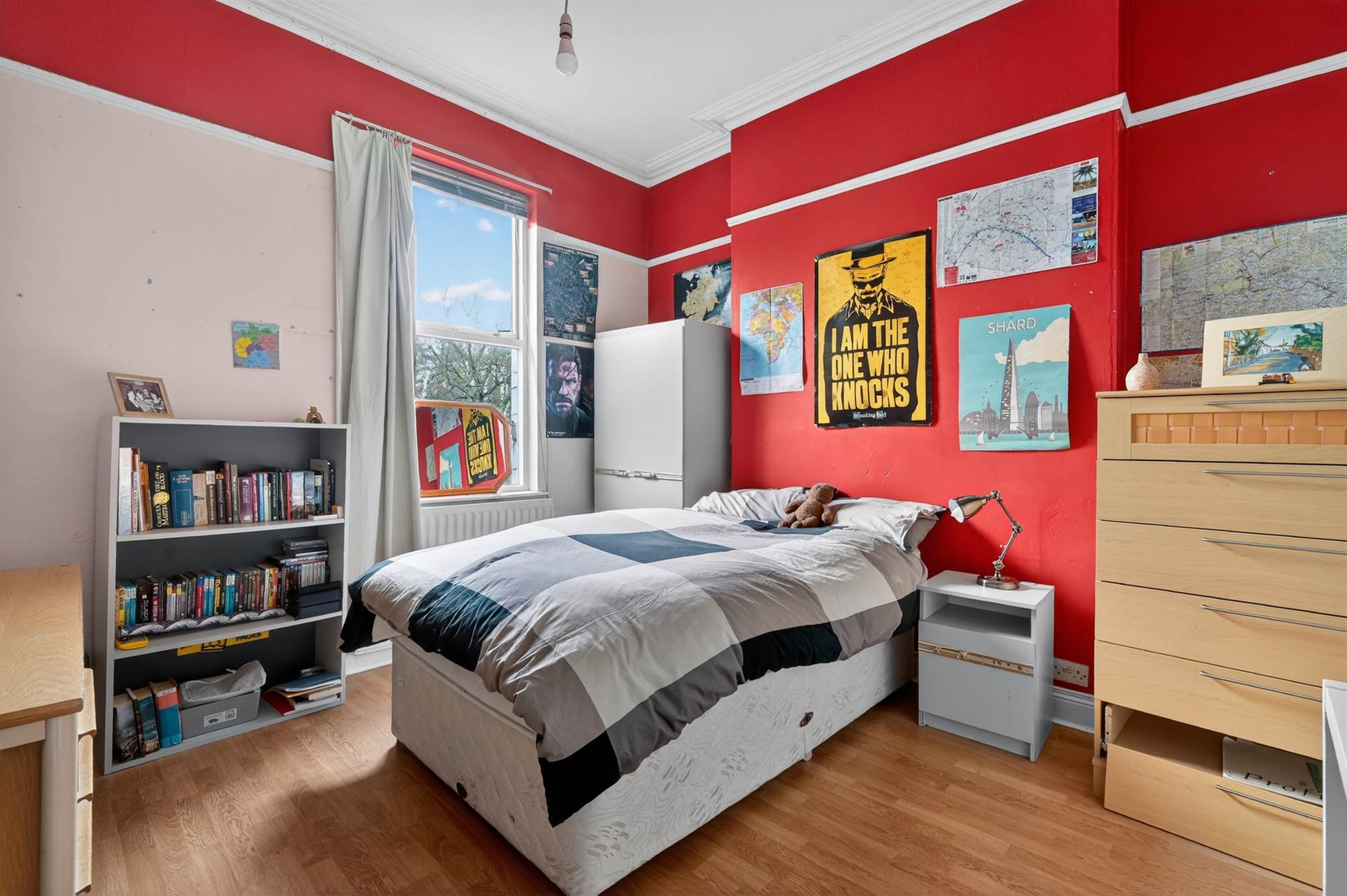 Exposed wooden floor, picture rail, cornice ceiling. Extensive wall-to wall built-in wardrobes and cupboards.