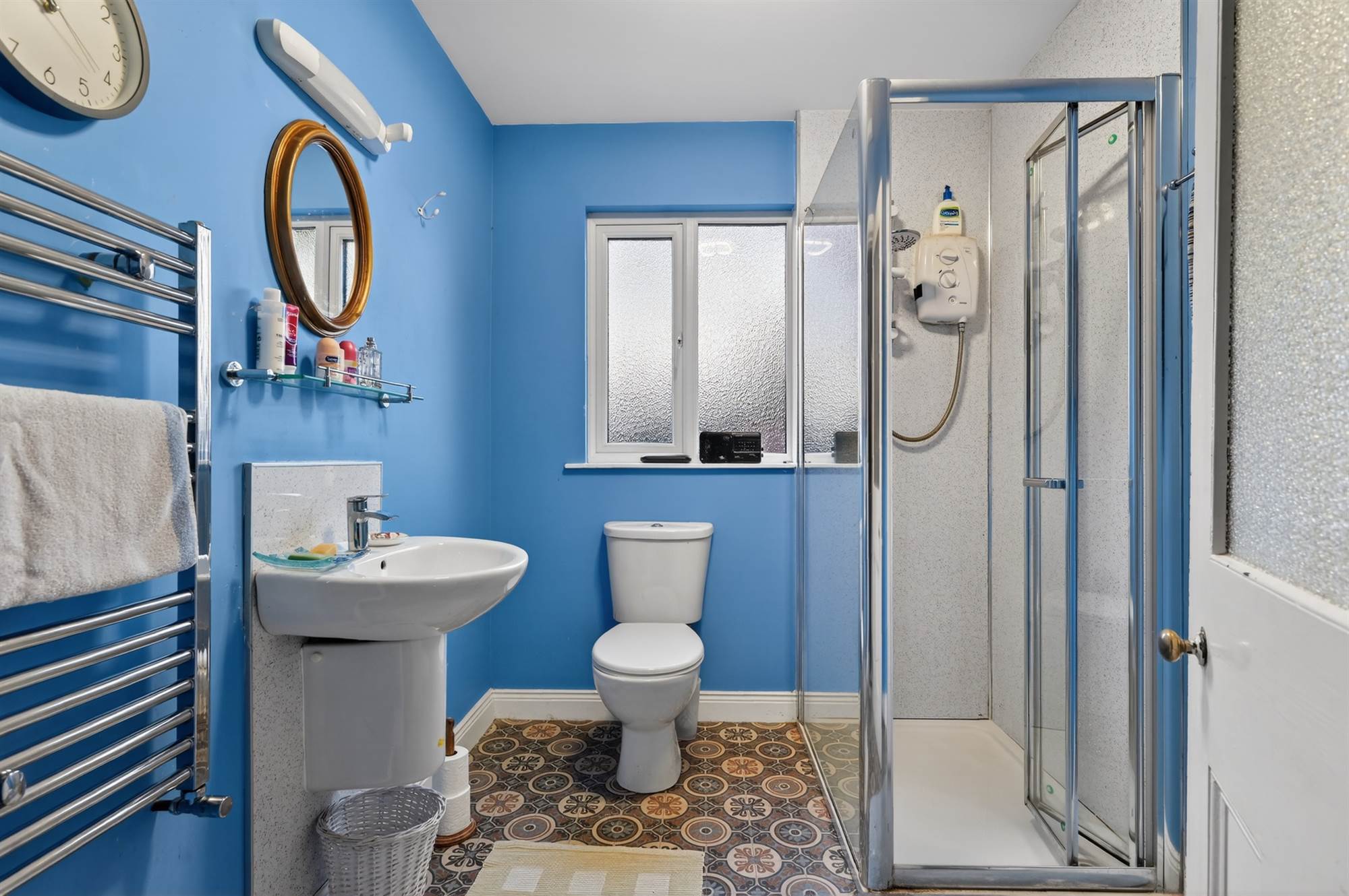 White suite comprising low flush wc, floating wash hand basin, PVC panelled splashback, chrome heated towel rail, built-in shower cubicle with Triton electric shower unit, PVC panelled splashback. Hatch to roofspace, extractor fan.