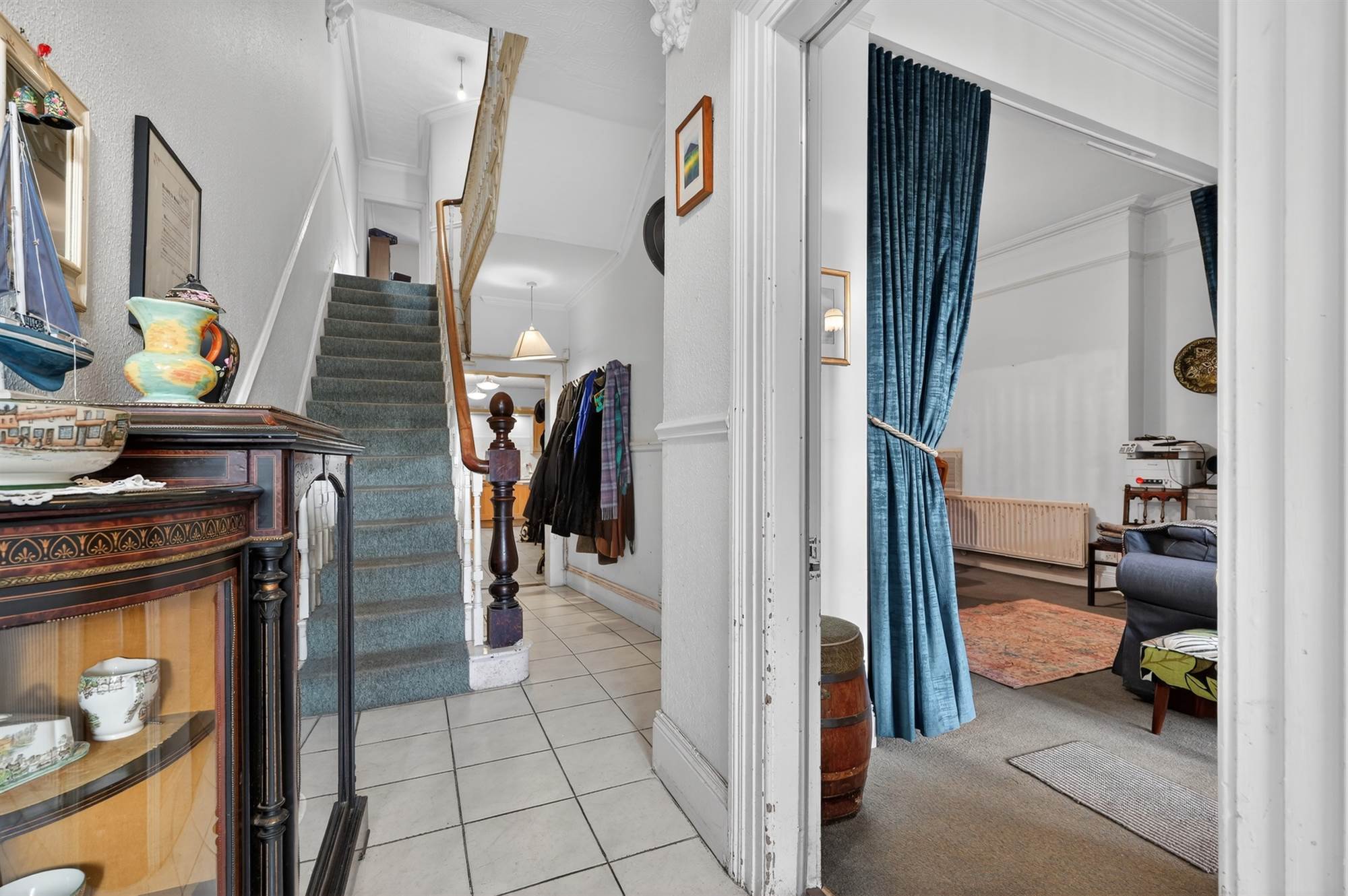 Ceramic tiled floor. Stained glass inner door and side light, glazed toplight, cornice ceiling, picture rail to: