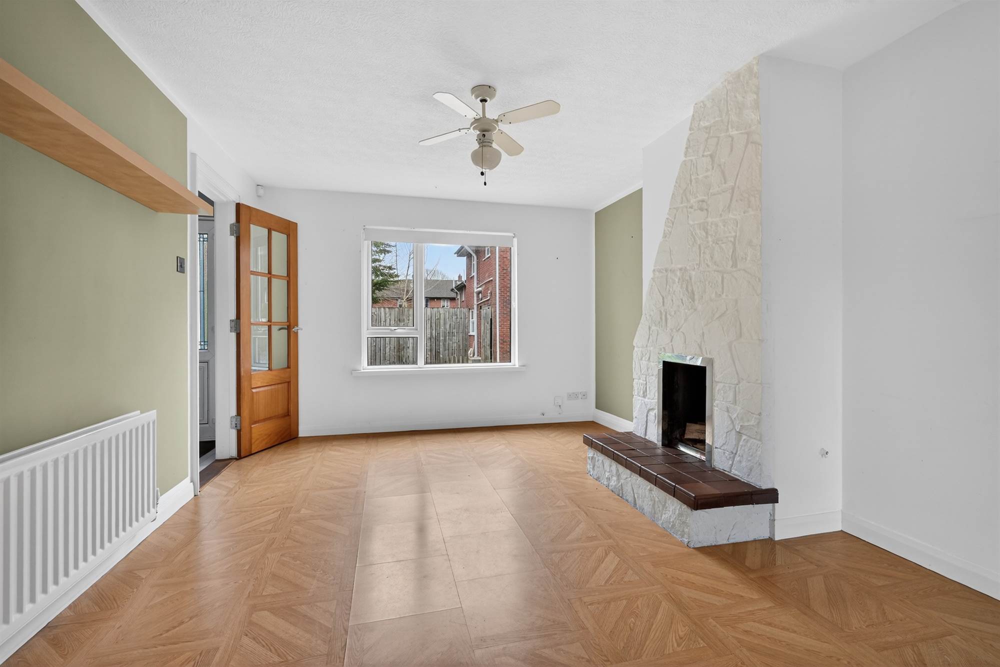 Raised fireplace with fire, tiled hearth, dual aspect windows.