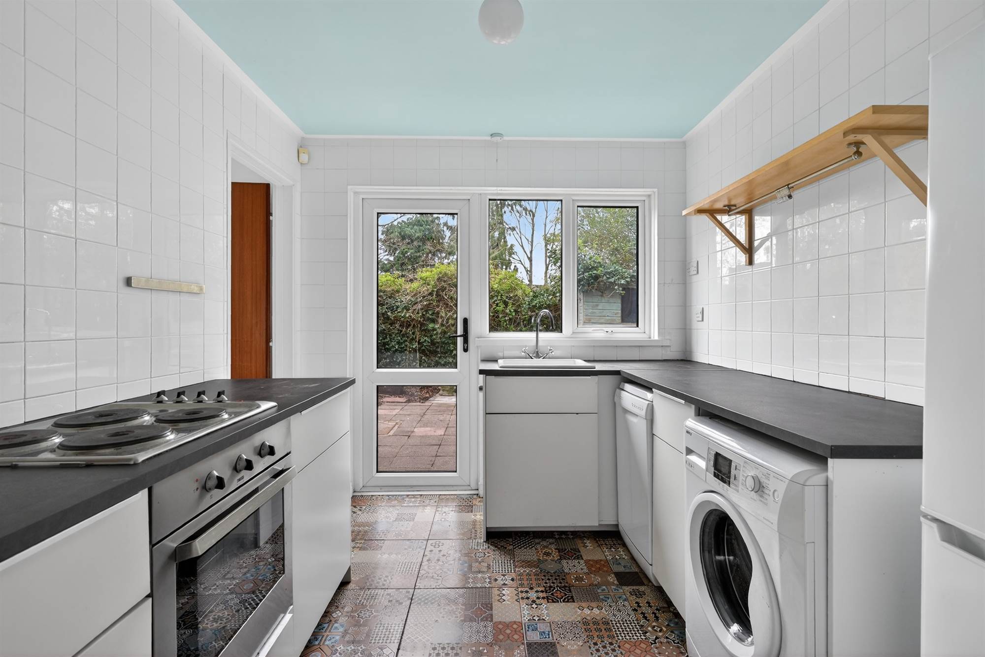 Range of low level units, laminate work surfaces, stainless steel four ring hob with built-in Zanussi oven, plumbed for washing machine, sink unit with chrome mixer tap, fully tiled walls, uPVC door to rear garden.